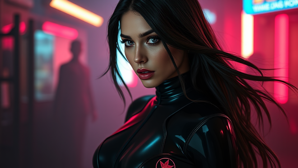 Superhero clad in sleek black latex, exuding allure with a strikingly beautiful face and long, flowing hair; embodying the futuristic allure of a cyberpunk world. Inspired by the atmospheric worlds of Cyberpunk 2077, Ghost in the Shell, Deus Ex, and Blade Runner, featuring a perfectly proportioned physique. Set against a backdrop of smoky, neon-lit ambiance, the scene captured in ultra-high definition with intricate and hyper-realistic details. Utilizing octane render and the powerful CGI techniques of Unreal Engine, crafted by the visionaries at Weta Digital and Wêtà FX. This cinematic masterpiece, akin to editorial photography, employs expert color grading and lighting techniques ranging from soft, natural illumination to dramatic, high contrast effects. Incorporating cutting-edge visual effects and post-production mastery, with elements like ray tracing reflections, volumetric lighting, and dynamic shaders. This stunning composition boasts spectacular lighting, from rim lights to moody ambient glows, enveloping the superhero in an aura of mystery and allure. The scene is replete with optical fiber highlights, global illumination, and ambient occlusion, creating a shimmering, lifelike presence balanced between reality and layered imagination.