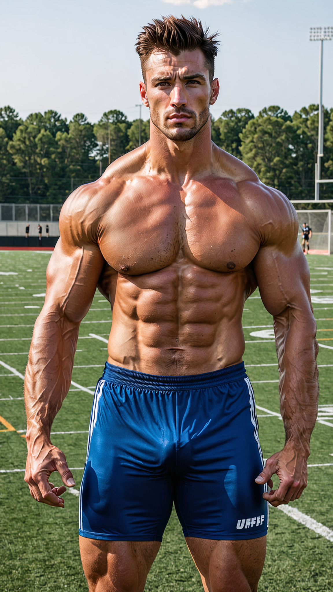 Superhero, football Player, sports figure, college football. Hypermasculine male, Caucasian white male, young man (about 18 thru 21). Very tall (6 foot 5), muscular, athletic, fit, wide back and shoulders, broad chest, narrow waist, big thighs and calves. Super strong, can lift a car. Unstoppable, can plow through his opponents on the football field. Handsome, rugged good looks. Dark brown very short straight hair, flat top hairstyle, close on sides and spiky on top. Deep set light brown eyes, strong brow and chin, mild soul patch on face. Black strips under his eyes to reduce glare. Shirtless, sweat dripping down his bare chest and legs after a hard practice. Black shoulder pads, elbow pads and knee pads on the outside of his body. Ultramarine blue shiny football shorts stretched over his bulging crotch, exposing his strong, muscular legs. Black cleated football shoes. Usually flexing his biceps, macho guy. Full body pose.