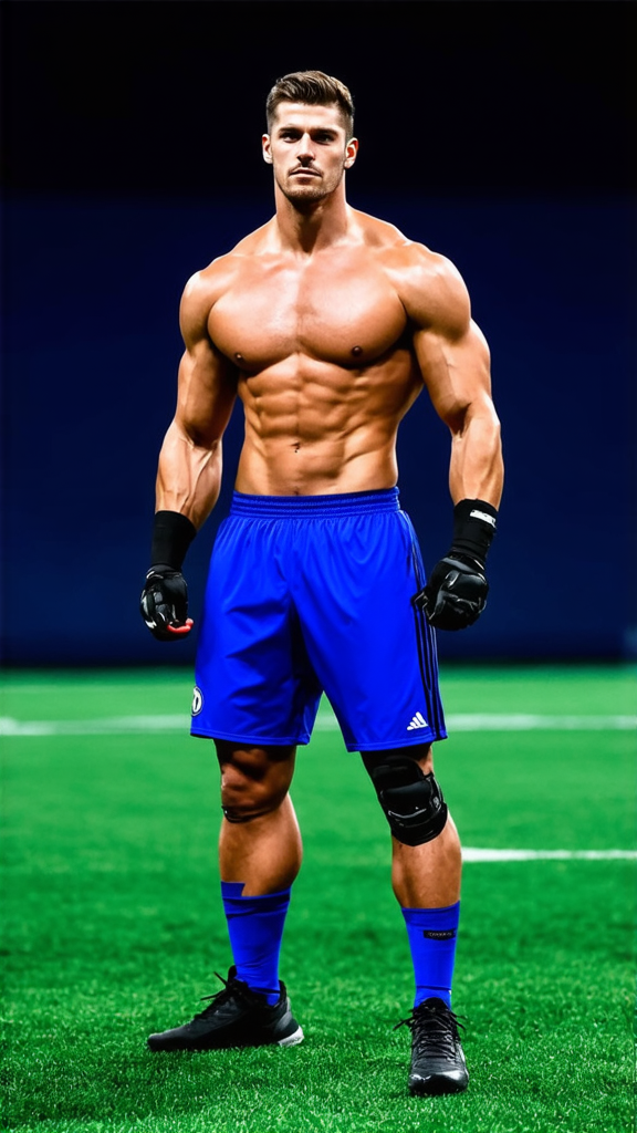Superhero, football Player, sports figure, college football. Hypermasculine male, Caucasian white male, young man (about 18 thru 21). Very tall (6 foot 5), muscular, athletic, fit, wide back and shoulders, broad chest, narrow waist, big thighs and calves. Super strong, can lift a car. Unstoppable, can plow through his opponents on the football field. Handsome, rugged good looks. Dark brown very short straight hair, flat top hairstyle, close on sides and spiky on top. Deep set light brown eyes, strong brow and chin, mild soul patch on face. Black strips under his eyes to reduce glare. Shirtless, sweat dripping down his bare chest and legs after a hard practice. Black shoulder pads, elbow pads and knee pads on the outside of his body. Ultramarine blue shiny football shorts stretched over his bulging crotch, exposing his strong, muscular legs. Black cleated football shoes. Usually flexing his biceps, macho guy. Full body pose.