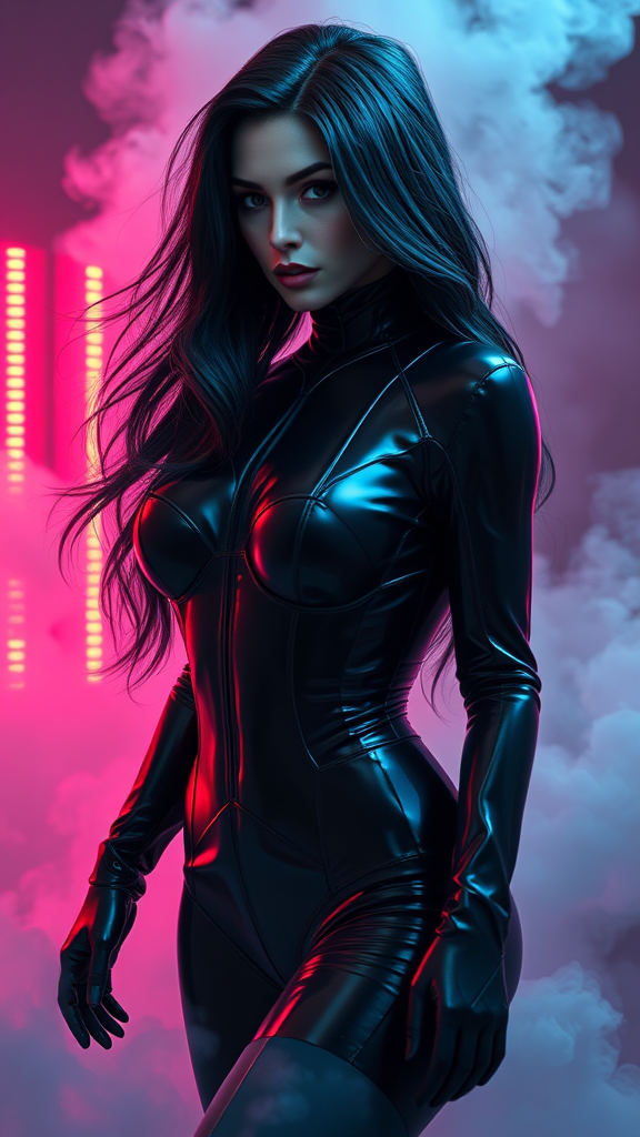 Superhero in sleek black latex suit, captivating features, realistic complexion, flowing luscious hair, curvaceous figure, full-body cyber-vixen, inspired by Cyberpunk 2077, Ghost in the Shell, Deus Ex, Blade Runner, The Matrix. Surrounded by ethereal smoke, ultra high-definition with exquisite detail. Hyper-realistic photography capturing intricate textures, rendered with octane and Unreal Engine precision, akin to Weta Digital and WLOP artistry. Cinematic color grading and editorial flair with dramatic high contrast, captured in 5D, 32k super-resolution. Enveloping neon glow with complex lighting dynamics—frontlight, backlight, soft studio, and moody volumetric illuminations. A seamless blend of artificial and natural light sources, highlighted by rim lights, incandescent tones, and optical fiber allure. Featuring remarkable shadows, shimmering surfaces, reflective ray tracing, screen space reflections, and advanced post-processing. Rich with ambient occlusion, chromatic nuances, anti-aliasing refinement, and nuanced shader applications. A masterwork of CGI and VFX, embodying a vibrant aesthetic with an intricately detailed and sophisticated presence.
