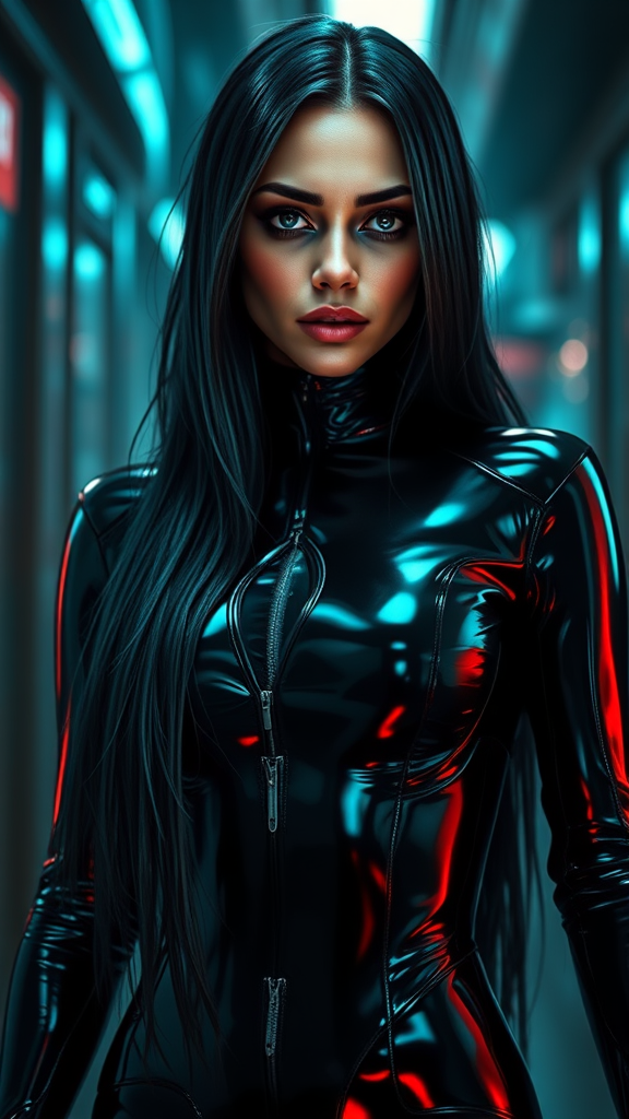 superhero in sleek black latex suit, stunning with lifelike features, radiant skin, and long, cascading hair; an iconic figure embodying the essence of cyberpunk worlds like Cyberpunk 2077, Ghost in the Shell, Deus Ex, and Blade Runner. A fusion of styles reminiscent of Matrix aesthetics, encapsulated in a photo that exudes intense realism and hyper-detail. Captured through the lens with a 50mm, f/1.6, showcasing a finely detailed costume under intricate lighting setups. Influences from cinematic giants like Weta Digital and Wêtà FX, with artistic touches by WLOP. The scene holds a moody, futuristic vibe, enhanced by neon lights and high-contrast settings. Shot using 5D technology, with super-resolution to 32k megapixels, ensuring vividness through ProPhoto RGB. Plays of light include spotlight, rim lighting, and backlighting, complemented by both natural and artificial sources, such as optical fibers and editing magic to achieve ambient occlusion and radiant reflections. Subtle shadows and shimmering surfaces come to life using ray tracing reflections and advanced GLSL shaders. Post-production excellence is achieved through tone mapping, CGI, and VFX to create something undeniably intricate and artistically rich.