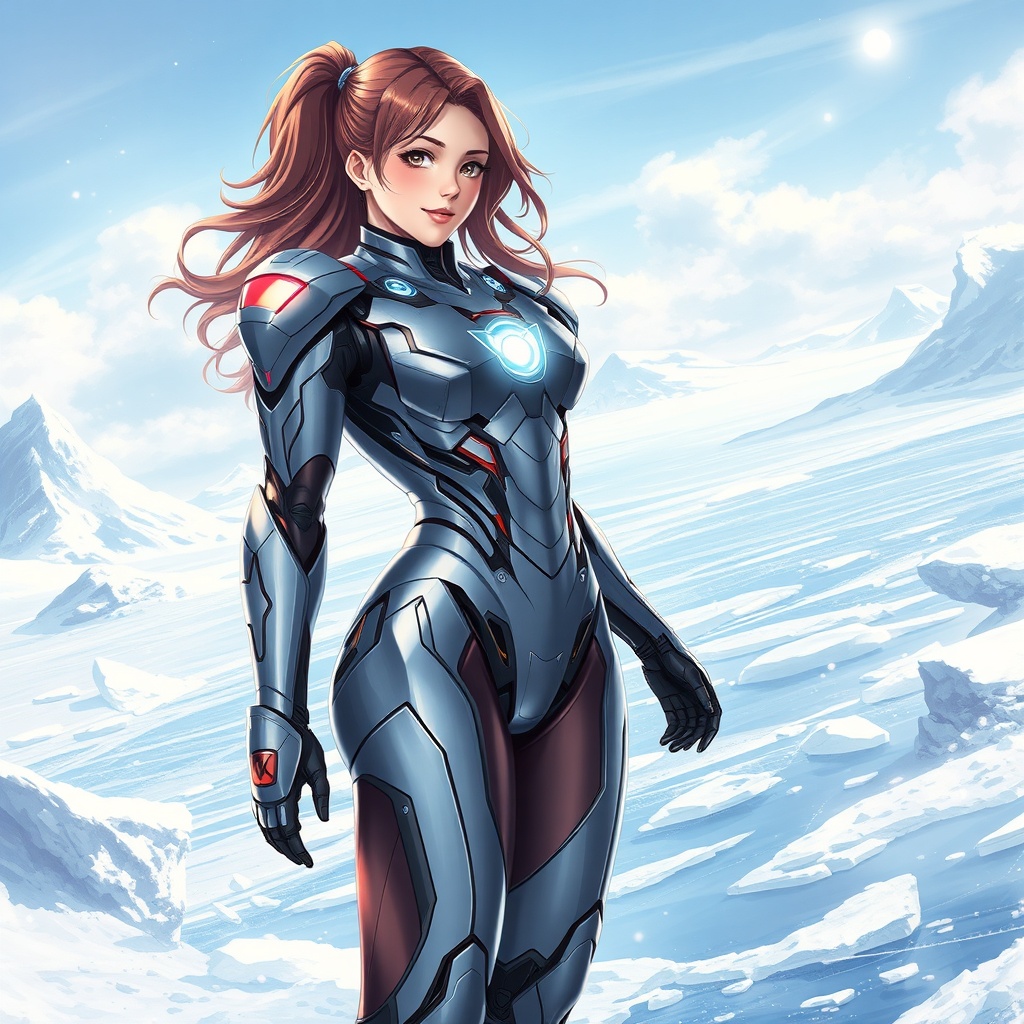 View this AI-generated image featuring a female superhero in an iron man inspired suit stands heroically in a serene icy landscape reminiscent of chill penguin s stage her curvaceous figure is accentuated by sleek metallic armor that seamlessly blends organic and mechanical elements featuring repuls