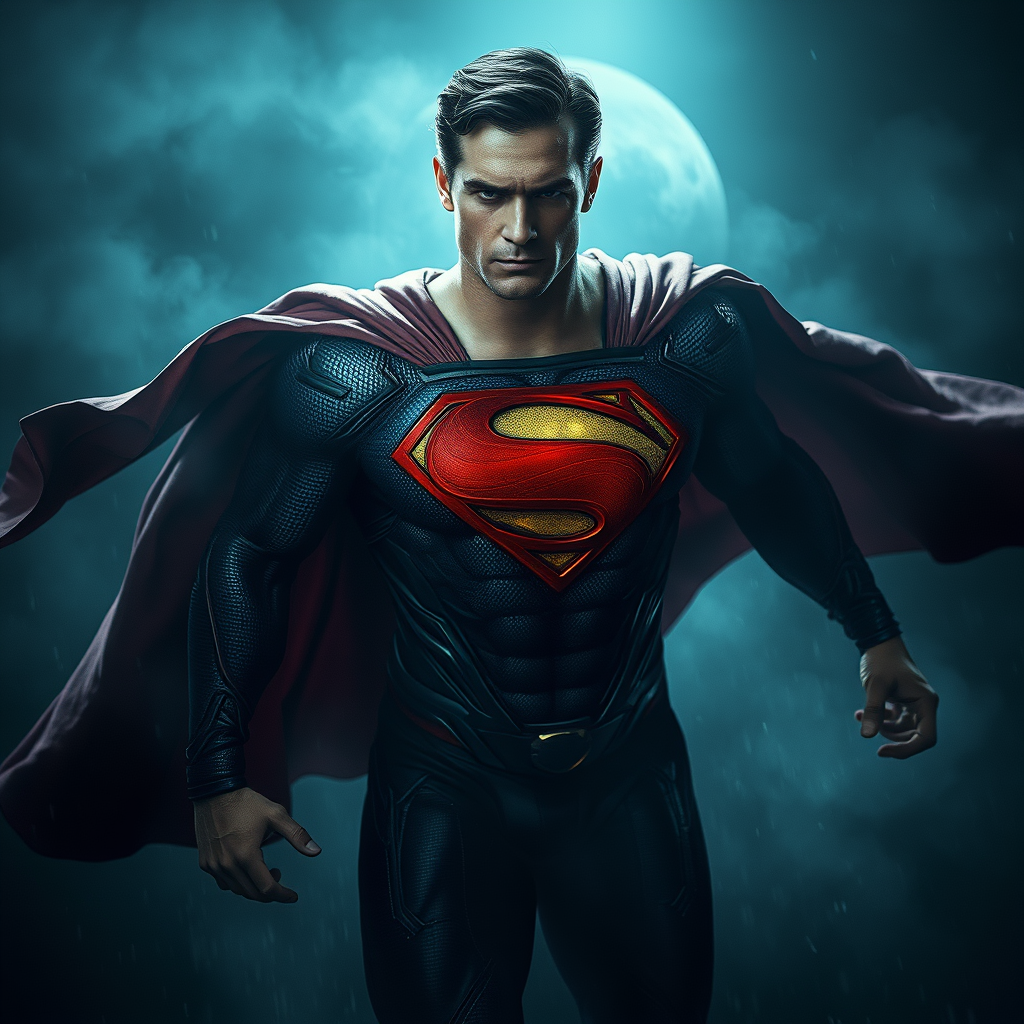 Superman emerges in a dynamic scene shrouded in atmospheric darkness and horror, where dramatic lighting accentuates his powerful form. The image is highly detailed, revealing secret nuances and intricacies, crafted with hyper-realistic attention to detail. In the style of wallpaper portraits, the piece breathes colorful realism, resembling an ultra-high-definition 8K image. The vibrant colors and meticulous details combine to create a portrayal that balances the hero’s strength with the haunting mood of the setting.