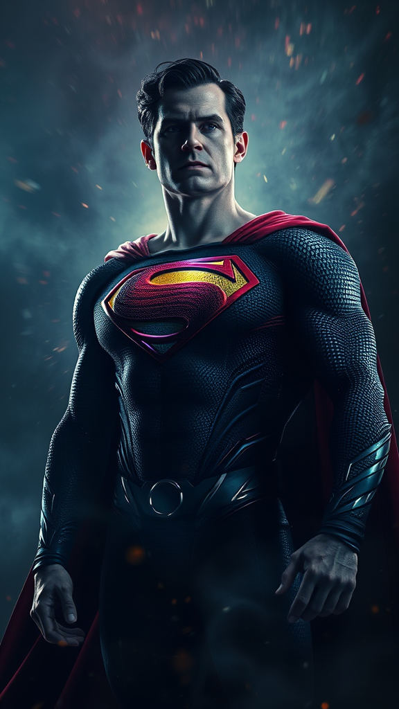 Superman stands amidst a swirling atmosphere of darkness and horror, his iconic figure illuminated by dramatic and intricate lighting. Every detail is painstakingly rendered, creating a hyper-realistic portrait that could serve as an epic wallpaper. Hidden details emerge upon closer inspection, bathed in vibrant colors that contrast against the shadowy backdrop. The scene captures the textured realism of his suit, the depth in his eyes, and the strength in his posture, all envisioned in ultra-high definition, showcasing the finest details and colorful realism in an 8K resolution. This reimagined Superman exudes a sense of mystery and power, inhabiting a world that is both familiar and fantastically dark.