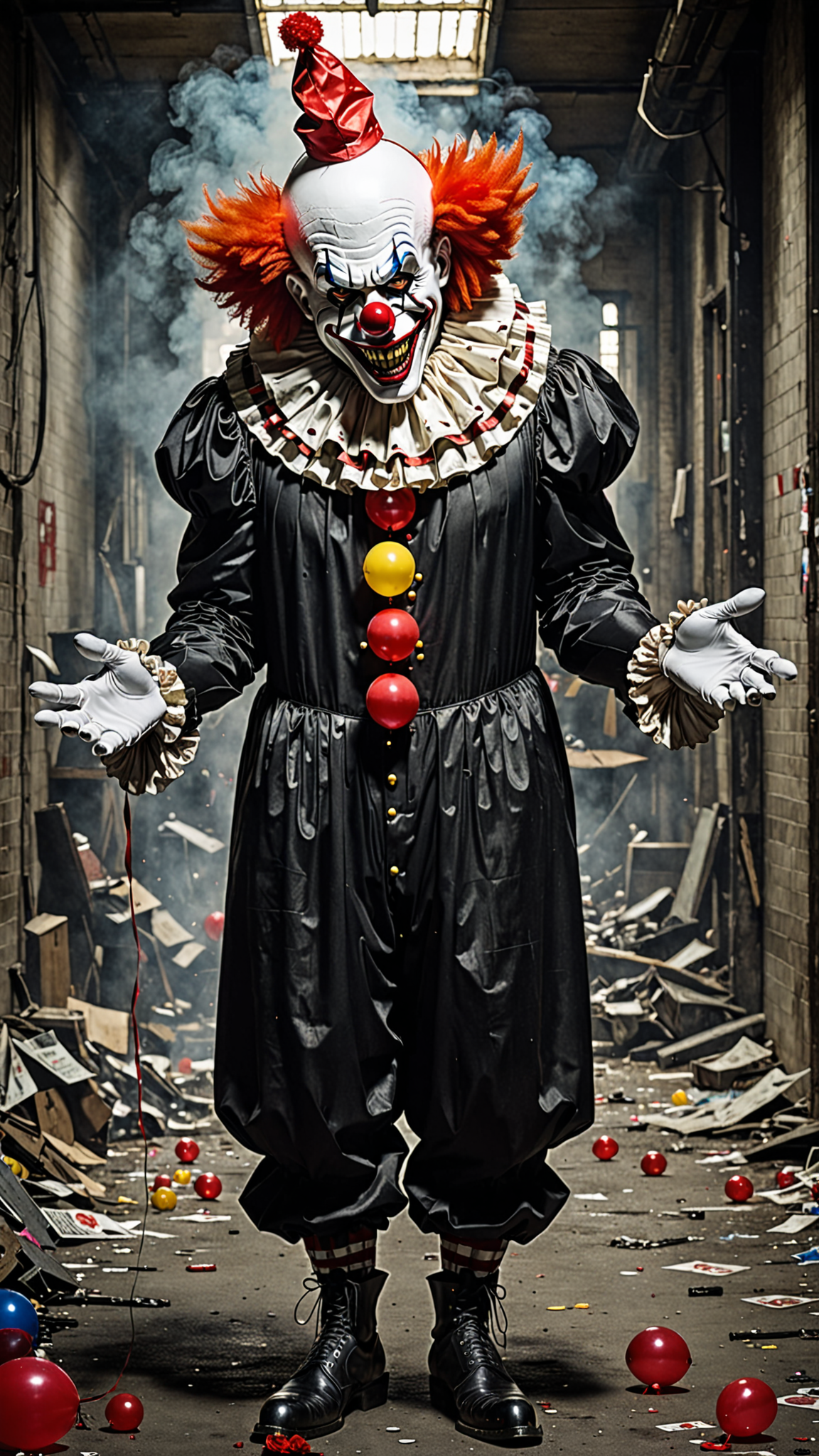 Supervillain, evil clown. Tall, stocky, strong. Big puffy clown costume in black and white. His clown make-up looks like a skull, aside from the big red clown nose that actually honks. Glowing red eyes. Black and white jester hat, sprawling out in all directions. His jokes are deadly: a toy pop-gun that actually shoots bullets when it says "bang". Flowers that squirt acid when sniffed. Balloons that explode in people's faces. For a clown, he has a dark sense of humor, laughing maniacally at things that aren't funny. He has an evil organ-grinding monkey as a pet, and its eyes glow evil red too. It's amazing that he's a clown at all, he hates people, and he REALLY HATES KIDS. the only things he finds funny are anarchy and death.