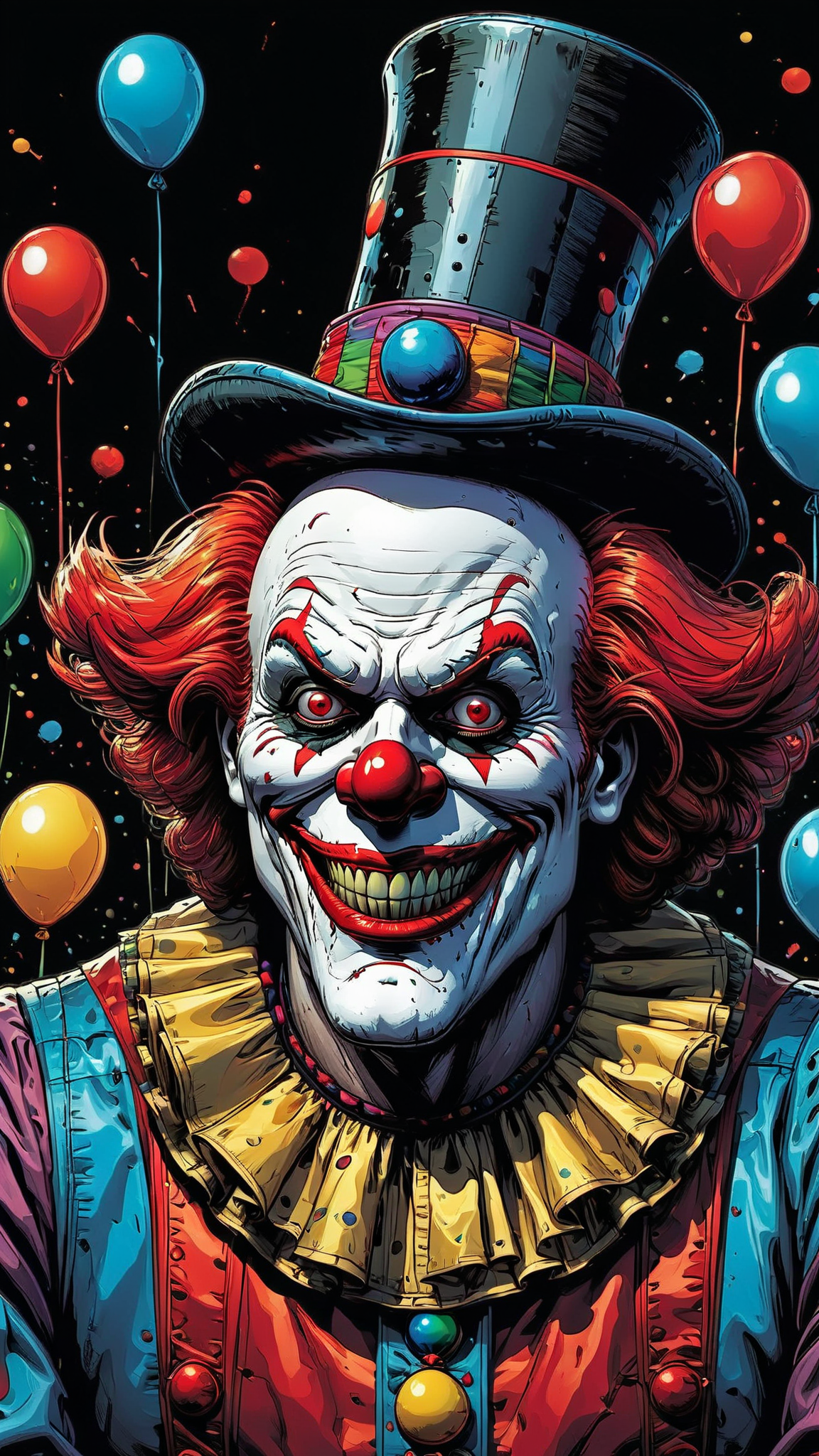 Supervillain, evil clown. Tall, stocky, strong. Big puffy clown costume in black and white. His clown make-up looks like a skull, aside from the big red clown nose that actually honks. Glowing red eyes. Black and white jester hat, sprawling out in all directions. His jokes are deadly: a toy pop-gun that actually shoots bullets when it says "bang". Flowers that squirt acid when sniffed. Balloons that explode in people's faces. For a clown, he has a dark sense of humor, laughing maniacally at things that aren't funny. He has an evil organ-grinding monkey as a pet, and its eyes glow evil red too. It's amazing that he's a clown at all, he hates people, and he REALLY HATES KIDS. the only things he finds funny are anarchy and death.