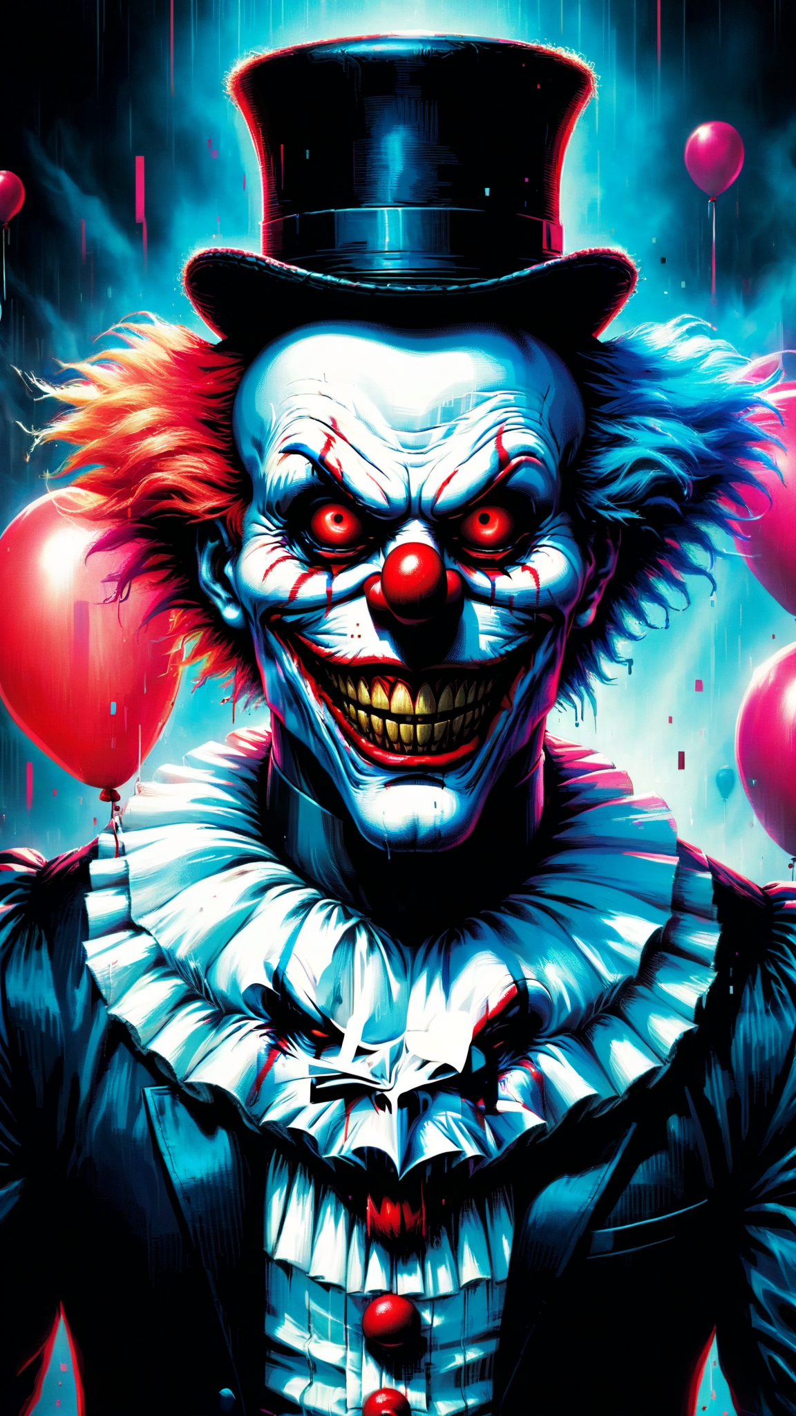 Supervillain, evil clown. Tall, stocky, strong. Big puffy clown costume in black and white. His clown make-up looks like a skull, aside from the big red clown nose that actually honks. Glowing red eyes. Black and white jester hat, sprawling out in all directions. His jokes are deadly: a toy pop-gun that actually shoots bullets when it says "bang". Flowers that squirt acid when sniffed. Balloons that explode in people's faces. For a clown, he has a dark sense of humor, laughing maniacally at things that aren't funny. He has an evil organ-grinding monkey as a pet, and its eyes glow evil red too. It's amazing that he's a clown at all, he hates people, and he REALLY HATES KIDS. the only things he finds funny are anarchy and death.