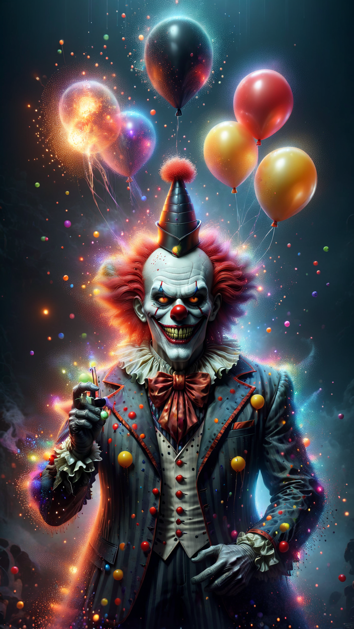 Supervillain, evil clown. Tall, stocky, strong. Big puffy clown costume in black and white. His clown make-up looks like a skull, aside from the big red clown nose that actually honks. Glowing red eyes. Black and white jester hat, sprawling out in all directions. His jokes are deadly: a toy pop-gun that actually shoots bullets when it says "bang". Flowers that squirt acid when sniffed. Balloons that explode in people's faces. For a clown, he has a dark sense of humor, laughing maniacally at things that aren't funny. He has an evil organ-grinding monkey as a pet, and its eyes glow evil red too. It's amazing that he's a clown at all, he hates people, and he REALLY HATES KIDS. the only things he finds funny are anarchy and death.