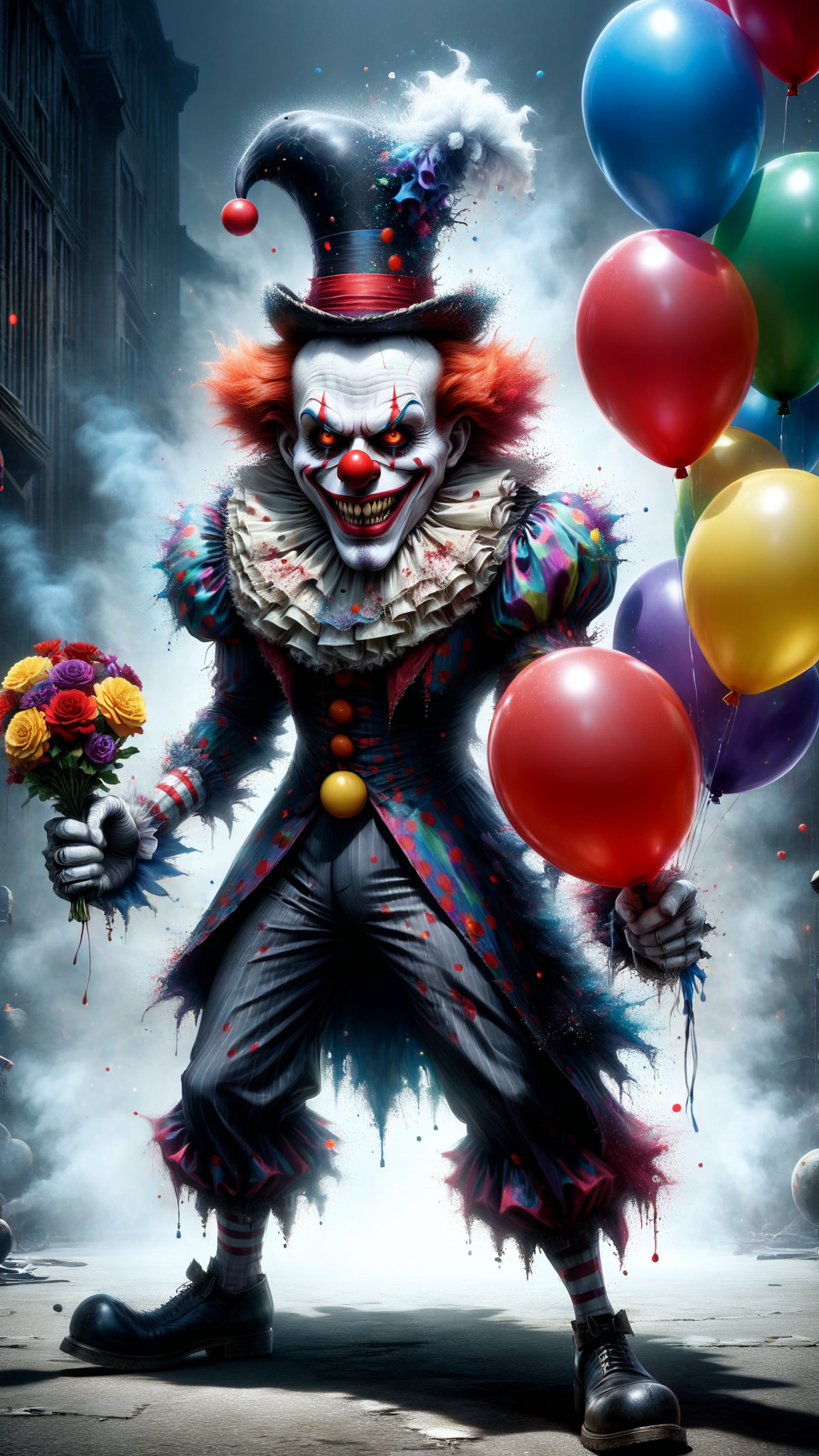 Supervillain, evil clown. Tall, stocky, strong. Big puffy clown costume in black and white. His clown make-up looks like a skull, aside from the big red clown nose that actually honks. Glowing red eyes. Black and white jester hat, sprawling out in all directions. His jokes are deadly: a toy pop-gun that actually shoots bullets when it says "bang". Flowers that squirt acid when sniffed. Balloons that explode in people's faces. For a clown, he has a dark sense of humor, laughing maniacally at things that aren't funny. He has an evil organ-grinding monkey as a pet, and its eyes glow evil red too. It's amazing that he's a clown at all, he hates people, and he REALLY HATES KIDS. the only things he finds funny are anarchy and death.