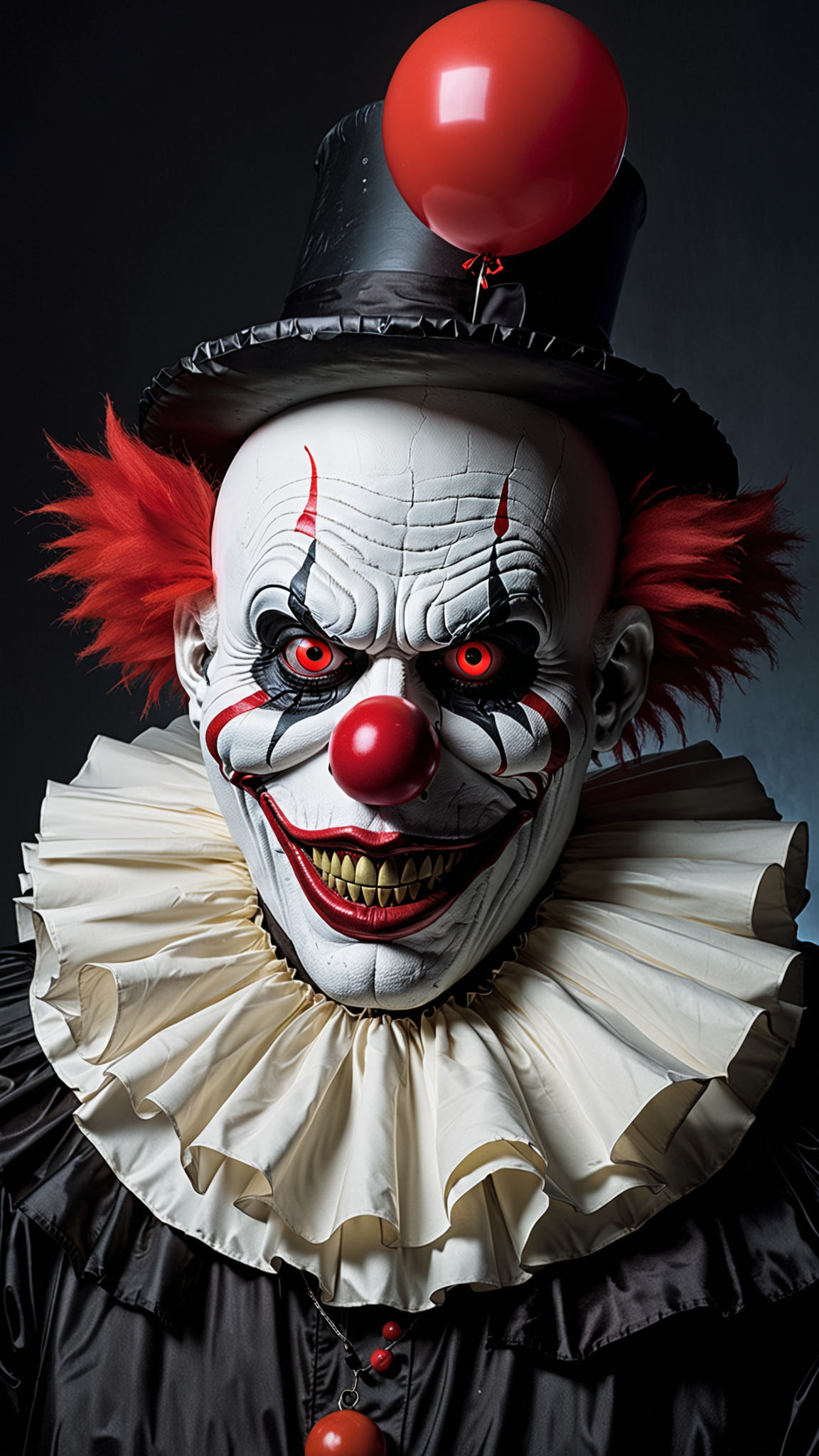 Supervillain, evil clown. Tall, stocky, strong. Big puffy clown costume in black and white. His clown make-up looks like a skull, aside from the big red clown nose that actually honks. Glowing red eyes. Black and white jester hat, sprawling out in all directions. His jokes are deadly: a toy pop-gun that actually shoots bullets when it says "bang". Flowers that squirt acid when sniffed. Balloons that explode in people's faces. For a clown, he has a dark sense of humor, laughing maniacally at things that aren't funny. He has an evil organ-grinding monkey as a pet, and its eyes glow evil red too. It's amazing that he's a clown at all, he hates people, and he REALLY HATES KIDS. the only things he finds funny are anarchy and death.
