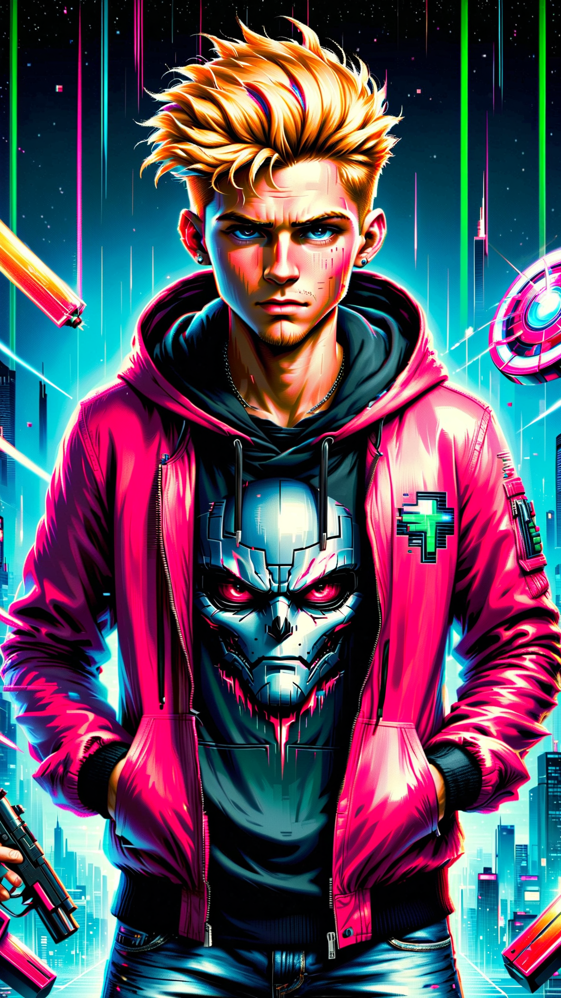 Supervillain, evil genius. Self-centered, whiny, brat, narcissistic, rude, a complete d-bag, and possibly a sociopath---and he's only a young teenaged kid (between 11 and 14years old). He is a trust fund kid from a very wealthy family, he's had everything handed to him on a silver platter. He's heard the word "no" maybe twice in his life. Spoiled, coddled, catered to, he has no idea how real people live, nor does he care. He cares about no one and nothing, but he LOVES TOYS...but not simple toys, he loves shiny things that light up and make noise (blip, bleep, bloop!), and he knows how to create them HIMSELF: toy guns that shoot real lasers, giant robots that terrorize people, dolls and teddy bears that carry weapons and attack people. His favorites are video games, the more violent the better. If they cause someone to go deaf or blind, not his problem. He's too smart for high school, and too much of a know-it-all for college. Caucasian young boy. He's tall, lithe, thin, wiry. He's average looking with a strawberry-blonde faux-hawk hairstyle and freckles. He wears braces on his teeth and is slightly geeky looking. He has light brown eyes with gold flecks. He usually wears acid washed jeans, sneakers of any color, t-shirts of any color, and a big black hoodie jacket . The only things that indicate that he has any money are the big diamond stud in his ear, the big gold chain around his neck, and the ridiculously expensive smart phone that most kids can't afford. His phone is his command center, and what he uses to program his evil toys. He will probably become a cyber criminal when he grows up...