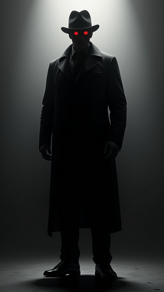 Supervillain. Horror, darkness. A shadow being. Everything on him is completely darkness, except for his eyes. His eyes are glowing red . He has no facial features or human skin, they are {{shadow}}. He appears to wear a fedora, a long black trenchcoat, a black suit and shoes. Bright light will make him turn solid, but he can become 2-Dimensional in the dark. His size and shape vary on who sees him, but he usually appears tall and thin. full body pose