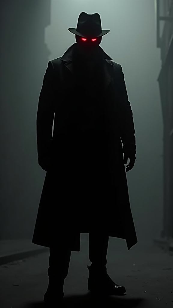 Supervillain. Horror, darkness. A shadow being. Everything on him is completely darkness, except for his eyes. His eyes are glowing red . He has no facial features or human skin, they are {{shadow}}. He appears to wear a fedora, a long black trenchcoat, a black suit and shoes. Bright light will make him turn solid, but he can become 2-Dimensional in the dark. His size and shape vary on who sees him, but he usually appears tall and thin. full body pose