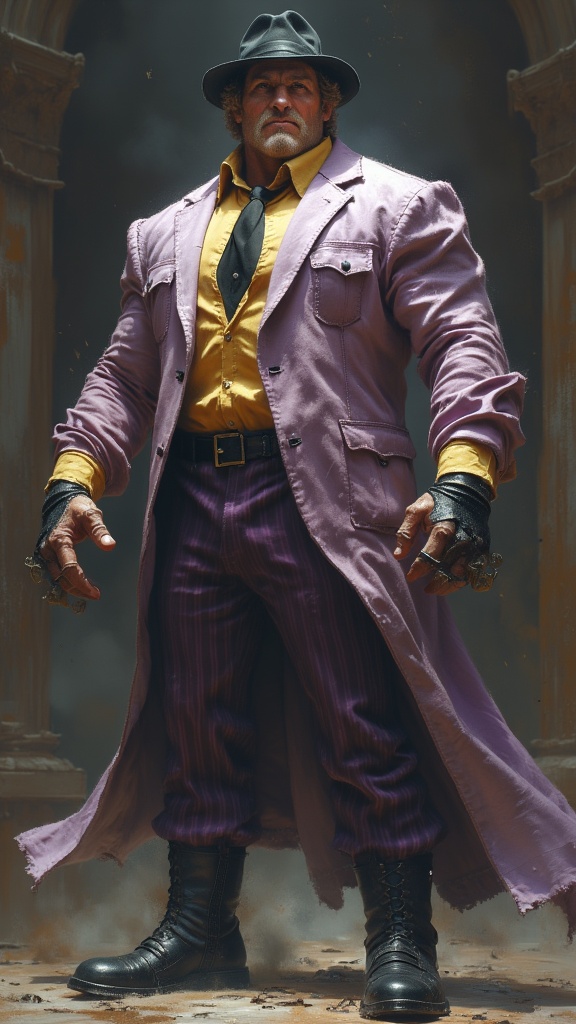 Supervillain. Mafia Bodyguard, wrestler. Young masculine caucasian male. Short, stocky, solid, massively muscled. Average looks, but strong jawed, usually smirking. Short curly strawberry-blonde hair, tousled and unruly, but he wears a black wide brimmed fedora on top of that. Light brown eyes, intense gaze. Soul-patch on face. Yellow button down shirt with black tie, pale lavender suit jacket. Dark purple dress pants with light purple pinstripes, black leather dress boots. Wide hands with big knuckles, perfect for punching. Full body pose, wearing a pair of brass knuckles.,wrestlers stance.