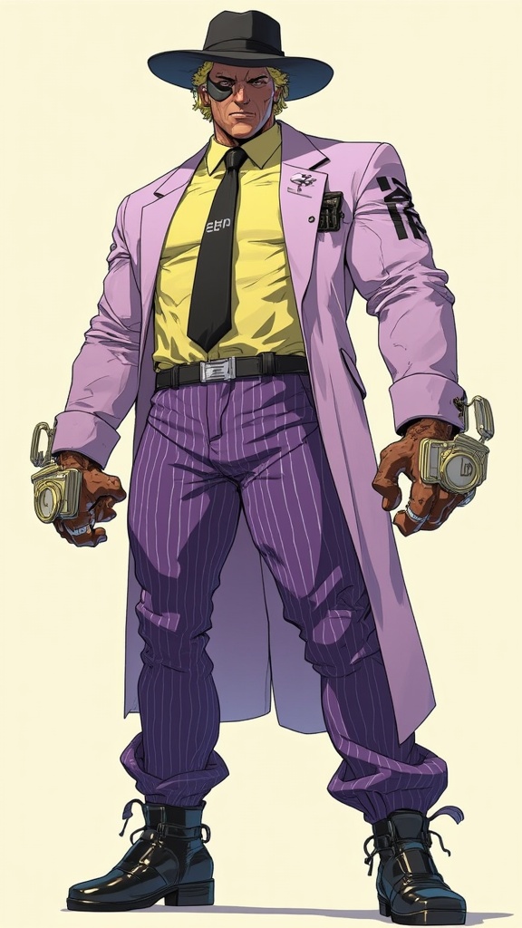 Supervillain. Mafia Bodyguard, wrestler. Young masculine caucasian male. Short, stocky, solid, massively muscled. Average looks, but strong jawed, usually smirking. Short curly strawberry-blonde hair, tousled and unruly, but he wears a black wide brimmed fedora on top of that. Light brown eyes, intense gaze. Soul-patch on face. Yellow button down shirt with black tie, pale lavender suit jacket. Dark purple dress pants with light purple pinstripes, black leather dress boots. Wide hands with big knuckles, perfect for punching. Full body pose, wearing a pair of brass knuckles.,wrestlers stance.