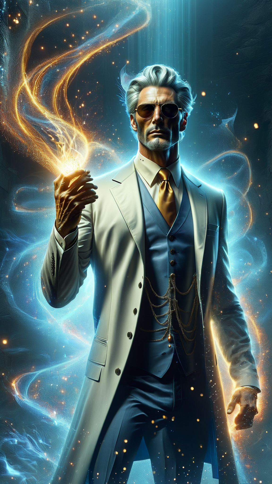 Supervillain, Reverend, preacher, false prophet. He can heal people, bright golden light comes from his hands when he does. He can heal ANY sickness or disease, cure any mental illness, cast out demons, he can even prophesy the future... but at a cost. He only does it for the ones HE approves as worthy. He has turned away many he considered unworthy. He's all fire and brimstone--- there's no love in him. What's worse, he thinks he alone was given gifts like this---he doesn't realize he's a super-powered mutant. Tall, slim, lanky but strong. Caucasion male of the Southern variety, middle aged man. Very short wavy silver hair, slicked back on his head. Pale grey eyes, but there usually under a pair of tinted sunglasses. Smooth and clean shaven, nary a hair on his face. He is slightly tanned from all that Southern sunshine. He is long limbed, with big hands for holding bibles or slapping people if he deems necessary. Off-white suit with a white collared shirt and blue tie, pale blue silk hankie in his pocket. Pale grey cowboy boots under his pant legs. Full body pose. He especially hates super-powered people, even though he IS ONE HIMSELF.
