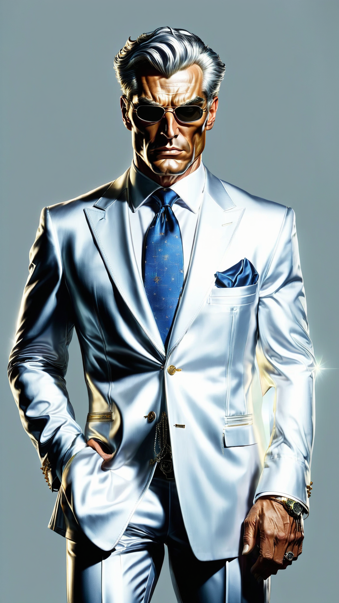 Supervillain, Reverend, preacher, false prophet. He can heal people, bright golden light comes from his hands when he does. He can heal ANY sickness or disease, cure any mental illness, cast out demons, he can even prophesy the future... but at a cost. He only does it for the ones HE approves as worthy. He has turned away many he considered unworthy. He's all fire and brimstone--- there's no love in him. What's worse, he thinks he alone was given gifts like this---he doesn't realize he's a super-powered mutant. Tall, slim, lanky but strong. Caucasion male of the Southern variety, middle aged man. Very short wavy silver hair, slicked back on his head. Pale grey eyes, but there usually under a pair of tinted sunglasses. Smooth and clean shaven, nary a hair on his face. He is slightly tanned from all that Southern sunshine. He is long limbed, with big hands for holding bibles or slapping people if he deems necessary. Off-white suit with a white collared shirt and blue tie, pale blue silk hankie in his pocket. Pale grey cowboy boots under his pant legs. Full body pose. He especially hates super-powered people, even though he IS ONE HIMSELF.