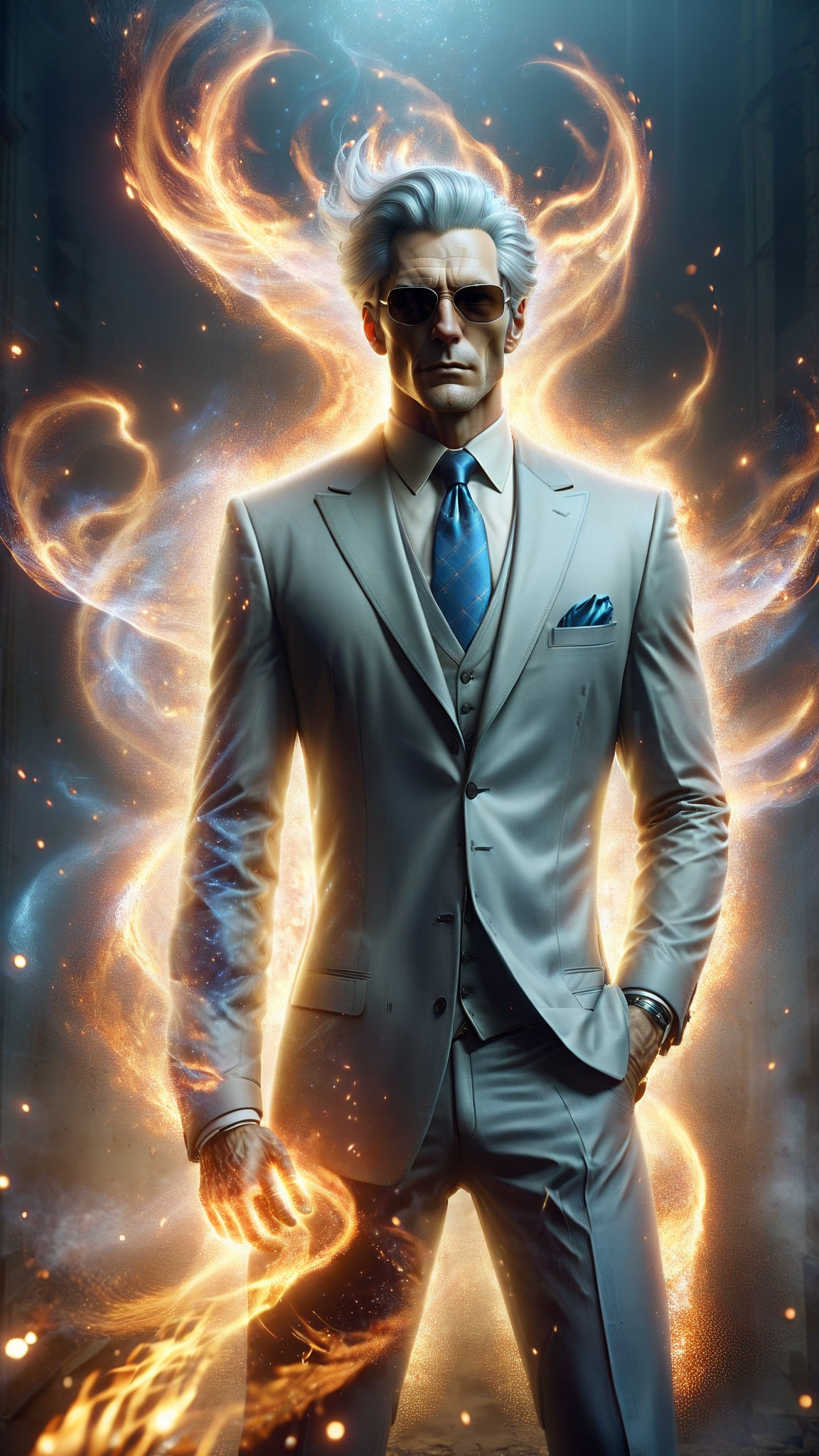 Supervillain, Reverend, preacher, false prophet. He can heal people, bright golden light comes from his hands when he does. He can heal ANY sickness or disease, cure any mental illness, cast out demons, he can even prophesy the future... but at a cost. He only does it for the ones HE approves as worthy. He has turned away many he considered unworthy. He's all fire and brimstone--- there's no love in him. What's worse, he thinks he alone was given gifts like this---he doesn't realize he's a super-powered mutant. Tall, slim, lanky but strong. Caucasion male of the Southern variety, middle aged man. Very short wavy silver hair, slicked back on his head. Pale grey eyes, but there usually under a pair of tinted sunglasses. Smooth and clean shaven, nary a hair on his face. He is slightly tanned from all that Southern sunshine. He is long limbed, with big hands for holding bibles or slapping people if he deems necessary. Off-white suit with a white collared shirt and blue tie, pale blue silk hankie in his pocket. Pale grey cowboy boots under his pant legs. Full body pose. He especially hates super-powered people, even though he IS ONE HIMSELF.
