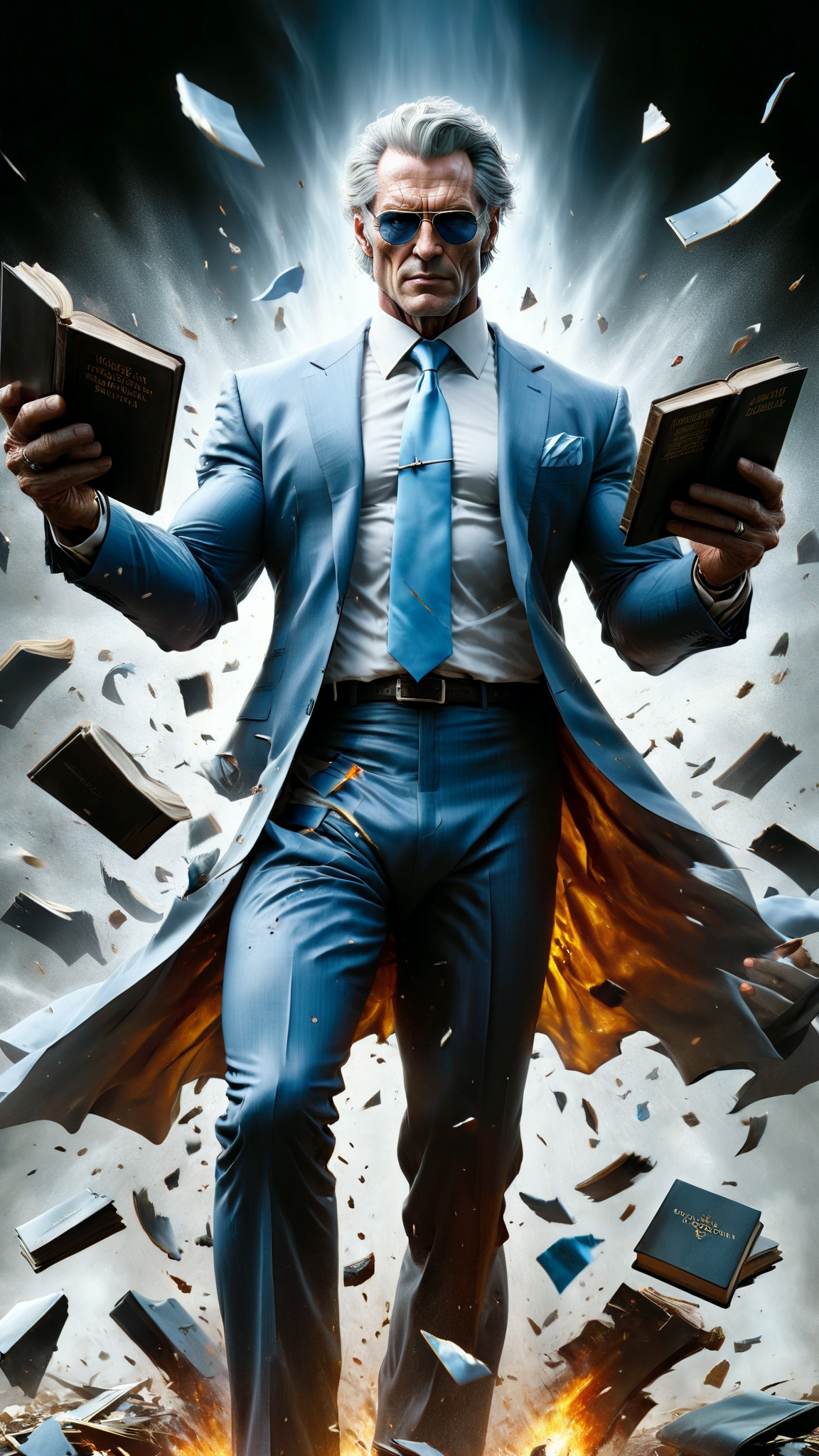 Supervillain, Reverend, preacher, false prophet. He can heal people, bright golden light comes from his hands when he does. He can heal ANY sickness or disease, cure any mental illness, cast out demons, he can even prophesy the future... but at a cost. He only does it for the ones HE approves as worthy. He has turned away many he considered unworthy. He's all fire and brimstone--- there's no love in him. What's worse, he thinks he alone was given gifts like this---he doesn't realize he's a super-powered mutant. Tall, slim, lanky but strong. Caucasion male of the Southern variety, middle aged man. Very short wavy silver hair, slicked back on his head. Pale grey eyes, but there usually under a pair of tinted sunglasses. Smooth and clean shaven, nary a hair on his face. He is slightly tanned from all that Southern sunshine. He is long limbed, with big hands for holding bibles or slapping people if he deems necessary. Off-white suit with a white collared shirt and blue tie, pale blue silk hankie in his pocket. Pale grey cowboy boots under his pant legs. Full body pose. He especially hates super-powered people, even though he IS ONE HIMSELF.