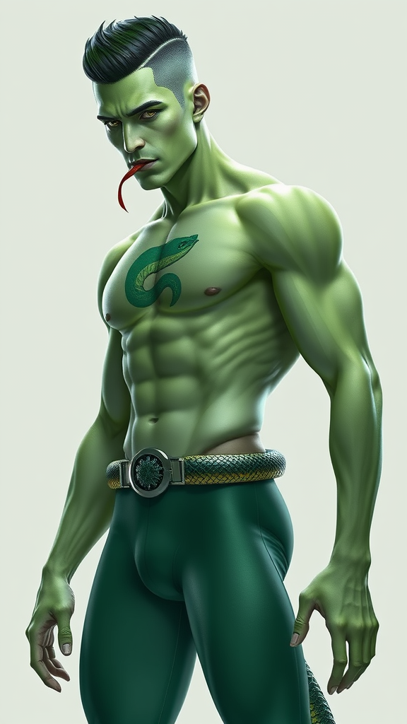 Supervillain, snakelike man. Hypermasculine male. Caucasian male with pale green skin. Green face, green body. Tall, thin, lithe. Muscular, sinewy, well defined. Thin, but broad shouldered. Narrow waisted. Pale green skin all over his body. Short black hair with dark green highlights, fade hairstyle slicked back, combed backed. Handsome face, chiseled jaw and strong brow. Yellow reptilian eyes, forked tongue. Bare chested with snakelike scales on his spine, around his abs, across his pecs, on his shoulders. Jade green circular tattoo of a coiled snake/ serpent on his chest. Green and yellow snakeskin pattern on his tights, solid jade green knee-high boots. Two metallic green snakes around his waist as a belt. Full body pose.