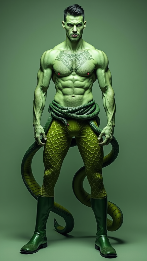 Supervillain, snakelike man. Hypermasculine male. Caucasian male with pale green skin. Green face, green body. Tall, thin, lithe. Muscular, sinewy, well defined. Thin, but broad shouldered. Narrow waisted. Pale green skin all over his body. Short black hair with dark green highlights, fade hairstyle slicked back, combed backed. Handsome face, chiseled jaw and strong brow. Yellow reptilian eyes, forked tongue. Bare chested with snakelike scales on his spine, around his abs, across his pecs, on his shoulders. Jade green circular tattoo of a coiled snake/ serpent on his chest. Green and yellow snakeskin pattern on his tights/pants, solid jade green knee-high boots. Two metallic green snakes around his waist as a belt. Full body pose.