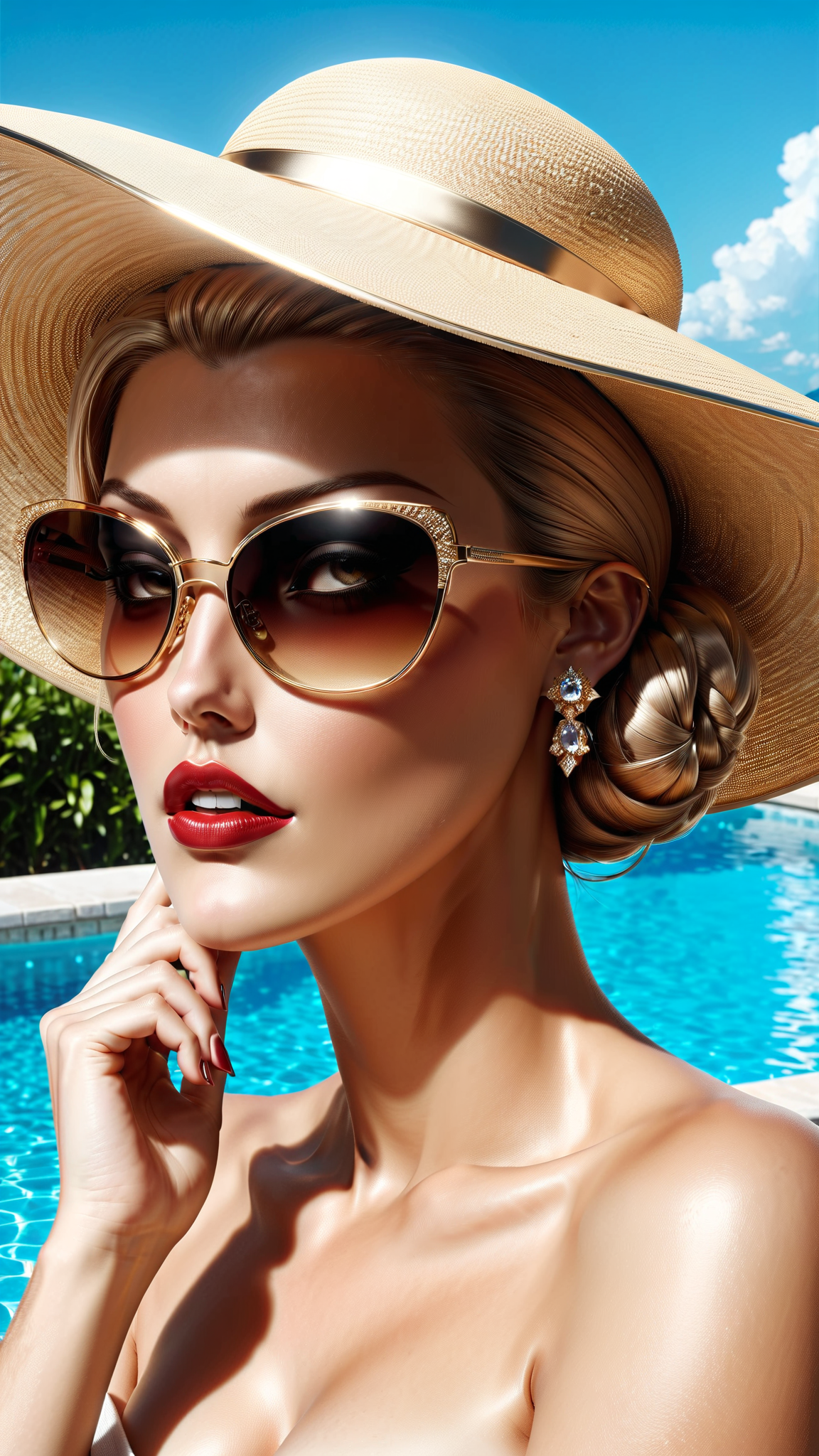 Supervillain, very powerful woman. Opulence, style, glamour. She has only one power, but it is EVERYTHING. She can curse anyone and MAKE IT STICK, and she's the only one that can disspell it. She is beautiful-- not that anyone really knows what she looks like. She ALWAYS has a pair of dark sunglasses on her face. She keeps her hair combed back in a bun and a large fashionable wide-brimmed hat on her head. {{{She keeps her hair tucked up under her hat, hair not readily visible}}} She is curvy. She likes to hang out at the pool in her bathing suit. She is well tanned, just like those beautiful women in the Ban-De-Soleil commercials. If not there, then a fancy 5-star restaurant, 5-star hotel, penthouse parties, anywhere the really wealthy hang out. She is supposedly a middle aged woman, but no one knows how old she really is, and you better not ask her. That for sure will get you cursed. She's the mystery lady in the dark sunglasses and really wide-brimmed hat... {{{Wide-brimmed jat obscures hair, hair not visible}}}