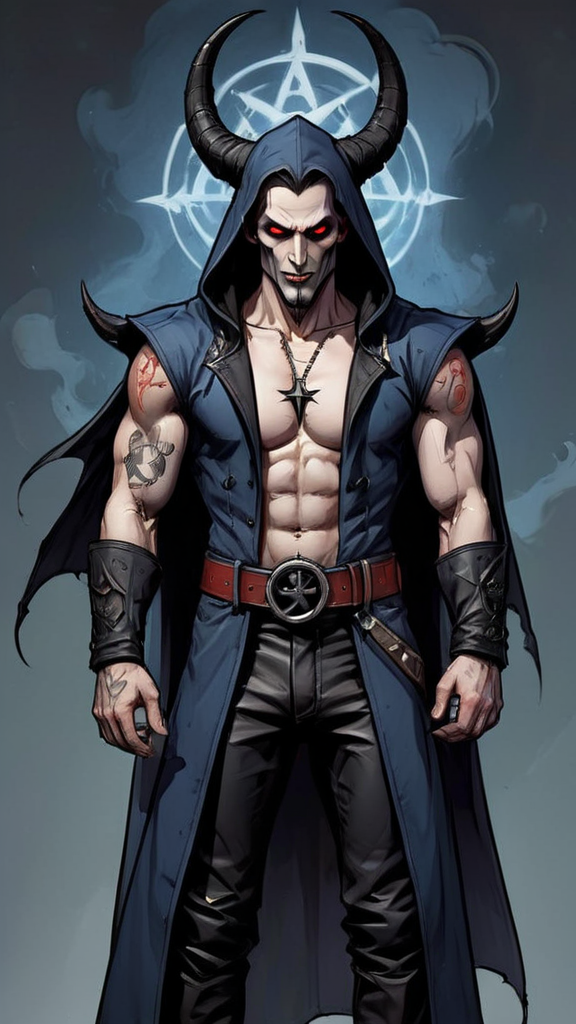 Supervillain, Warlock, evil male witch. He keeps an evil Book of Shadows, the cover is made of human skin. He can summon energy from the Netherworld, all his spells are dark. The energy manifests as blue-black, he uses it for many different effects. He is a cult leader at night, a businessman during the day. He keeps a statue of Baphomet on his altar, and an inverted penatacle on his person at all times, usually a silver chain around his neck. Caucasian masculine white male. Tall, slim, lithe but muscular, wide shoulders. Pale skin, brown eyes, strong brow and jaw, prominent cheeckbones. Hairless face aside from a dark brown goatee on his chin. Long dark brown hair that he keeps combed and slicked back into a low hanging ponytail. He wears black goth styled make-up around his eyes. A loose-fitting midnight blue sleeveless shirt that exposes his arms. He has a tattoo of The Devil on his left upper arm. His shirt is tucked into his pants of the same color, but the shirt is open to reveal the top part of his chest. His silver inverted pentacle hangs prominently from his neck. Black leather bracers on his arms. A heavy black leather belt with silver grommets around his waist, an inverted pentacle as the buckle. Black leather riding boots on his feet, pants tucked into them. Lastly, he wears a long hooded cape that is black on the hood and fades into midnight blue towards the edges of the cape. There are red demonic sigils on the shoulders and edges of the cape. He carries a ceremonial Satanic dagger, but isn't afraid to use it as a weapon if his magic fails. Full body pose, probably committing some evil.