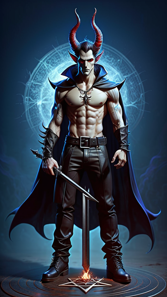 Supervillain, Warlock, evil male witch. He keeps an evil Book of Shadows, the cover is made of human skin. He can summon energy from the Netherworld, all his spells are dark. The energy manifests as blue-black, he uses it for many different effects. He is a cult leader at night, a businessman during the day. He keeps a statue of Baphomet on his altar, and an inverted penatacle on his person at all times, usually a silver chain around his neck. Caucasian masculine white male. Tall, slim, lithe but muscular, wide shoulders. Pale skin, brown eyes, strong brow and jaw, prominent cheeckbones. Hairless face aside from a dark brown goatee on his chin. Long dark brown hair that he keeps combed and slicked back into a low hanging ponytail. He wears black goth styled make-up around his eyes. A loose-fitting midnight blue sleeveless shirt that exposes his arms. He has a tattoo of The Devil on his left upper arm. His shirt is tucked into his pants of the same color, but the shirt is open to reveal the top part of his chest. His silver inverted pentacle hangs prominently from his neck. Black leather bracers on his arms. A heavy black leather belt with silver grommets around his waist, an inverted pentacle as the buckle. Black leather riding boots on his feet, pants tucked into them. Lastly, he wears a long hooded cape that is black on the hood and fades into midnight blue towards the edges of the cape. There are red demonic sigils on the shoulders and edges of the cape. He carries a ceremonial Satanic dagger, but isn't afraid to use it as a weapon if his magic fails. Full body pose, probably committing some evil.