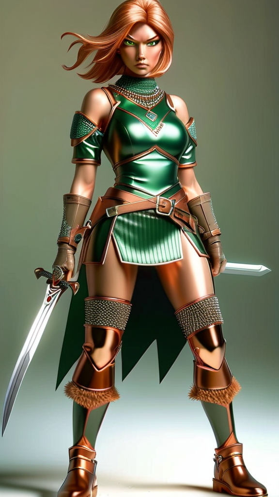 Supervillain, warrior, assassin. Caucasian female, medium height, thin but athletic, quick and dexterous. Brown eyes (always alert), thin eyebrows, average looks. Short length sandy blonde hair just above the shoulders, middle parted with feathered Bangs and volumous feathered hairstyle. Off the shoulder hunter green crop-top with short sleeves and Copper chainmail armor accents, exposing her midriff. Copper bracers on arms. A triangular hunter-green short skirt, the long part in the middle and high on the sides of the hips, joined and held by Copper chainmail accents. Copper colored bucket boots just below the knees, medium boot heels. She carries 2 razor sharp katanas, electrified to zap her target as well as cut them. If she faces any sort of physical attack, she automatically teleports away from the attack. Her bosses send her when they want someone killed quick, and she's more than happy to oblige. Full body pose.