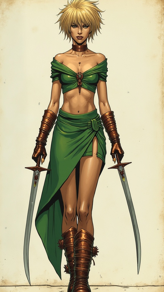 Supervillain, warrior, assassin. Caucasian female, medium height, thin but athletic, quick and dexterous. Brown eyes (always alert), rakish looking, sharp features, very plain, somewhat masculine face. Short length sandy blonde hair just above the shoulders, middle parted with feathered Bangs and volumous feathered hairstyle. Off the shoulder hunter green crop-top with short sleeves and Copper chainmail armor accents, exposing her midriff. Copper bracers on arms. A triangular hunter-green short skirt, the long part in the middle and high on the sides of the hips, joined and held by Copper chainmail accents. Copper colored bucket boots just below the knees, medium boot heels. She carries 2 razor sharp katanas, electrified to zap her target as well as cut them. If she faces any sort of physical attack, she automatically teleports away from the attack. Her bosses send her when they want someone killed quick, and she's more than happy to oblige. Full body pose.