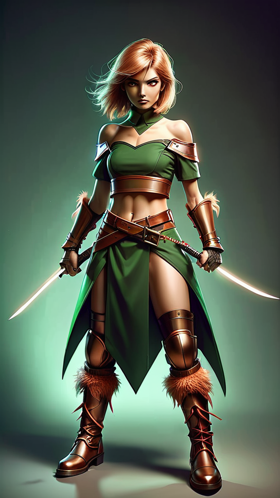 Supervillain, warrior, assassin. Caucasian female, medium height, thin but athletic, quick and dexterous. Brown eyes (always alert), rakish looking, sharp features, very plain, somewhat masculine face. Short length sandy blonde hair just above the shoulders, middle parted with feathered Bangs and volumous feathered hairstyle. Off the shoulder hunter green crop-top with short sleeves and Copper chainmail armor accents, exposing her midriff. Copper bracers on arms. A triangular hunter-green short skirt, the long part in the middle and high on the sides of the hips, joined and held by Copper chainmail accents. Copper colored bucket boots just below the knees, medium boot heels. She carries 2 razor sharp katanas, electrified to zap her target as well as cut them. If she faces any sort of physical attack, she automatically teleports away from the attack. Her bosses send her when they want someone killed quick, and she's more than happy to oblige. Full body pose.