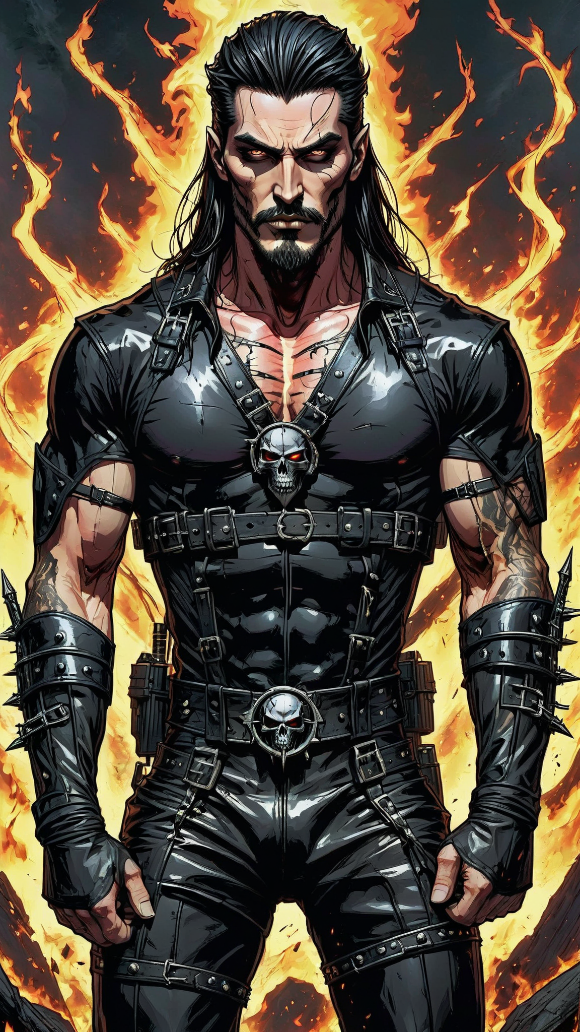 Supervillain with infernal ties. He can cause quakes by stomping, and has the ability to magnifyi any negative emotions, especially anger. He tends to smolder with red flames in some spots of his body. Caucasian male, masculine. Speed Metal/Death Metal fan. Tall, lanky, slender but muscular, sinewy, well defined. Pale skin, dark eyes, dark Goatee on face. Straight, black, long hair, parted down the middle. 3 spiked piercings running down his forehead. Dark Goth make-up around his eyes. He wears a black, long sleeved mesh T-shirt. Black Leather bracers on his arms with barbed wire. Black leather pants. Black leather belt with spikes, heavy black engineer boots. He has infernal ties, so he exudes faint black smoke wherever he goes, and might be smoldering a little. Full body pose.