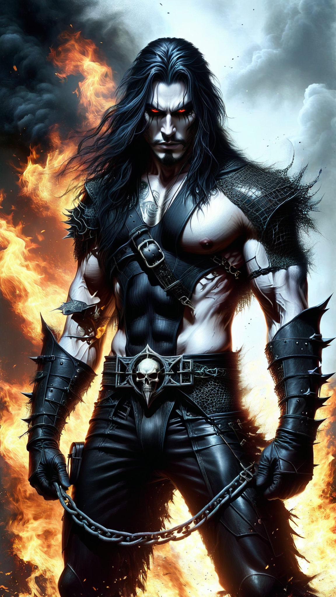 Supervillain with infernal ties. He can cause quakes by stomping, and has the ability to magnifyi any negative emotions, especially anger. He tends to smolder with red flames in some spots of his body. Caucasian male, masculine. Speed Metal/Death Metal fan. Tall, lanky, slender but muscular, sinewy, well defined. Pale skin, dark eyes, dark Goatee on face. Straight, black, long hair, parted down the middle. 3 spiked piercings running down his forehead. Dark Goth make-up around his eyes. He wears a black, long sleeved mesh T-shirt. Black Leather bracers on his arms with barbed wire. Black leather pants. Black leather belt with spikes, heavy black engineer boots. He has infernal ties, so he exudes faint black smoke wherever he goes, and might be smoldering a little. Full body pose.