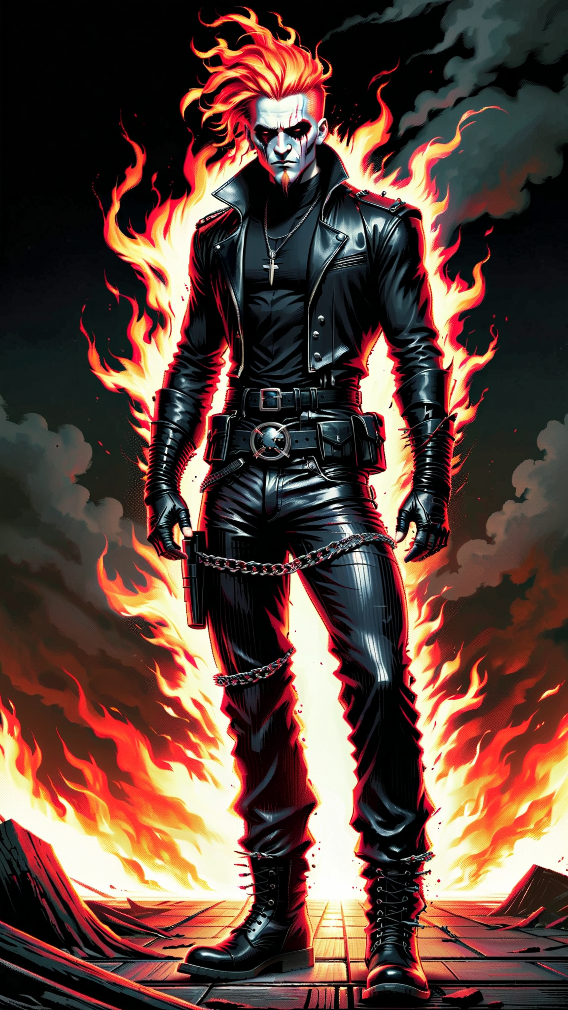 Supervillain with infernal ties. He can cause quakes by stomping, and has the ability to magnifyi any negative emotions, especially anger. He tends to smolder with red flames in some spots of his body. Caucasian male, masculine. Speed Metal/Death Metal fan. Tall, lanky, slender but muscular, sinewy, well defined. Pale skin, dark eyes, dark Goatee on face. Straight, black, long hair, parted down the middle. 3 spiked piercings running down his forehead. Dark Goth make-up around his eyes. He wears a black, long sleeved mesh T-shirt. Black Leather bracers on his arms with barbed wire. Black leather pants. Black leather belt with spikes, heavy black engineer boots. He has infernal ties, so he exudes faint black smoke wherever he goes, and might be smoldering a little. Full body pose.