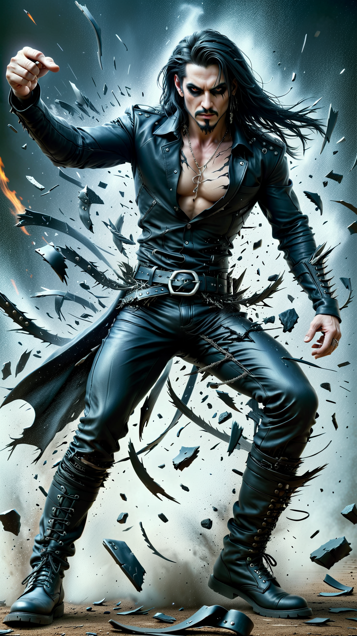Supervillain with infernal ties. He can cause quakes by stomping, and has the ability to magnifyi any negative emotions, especially anger. He tends to smolder with red flames in some spots of his body. Caucasian male, masculine. Speed Metal/Death Metal fan. Tall, lanky, slender but muscular, sinewy, well defined. Pale skin, dark eyes, dark Goatee on face. Straight, black, long hair, parted down the middle. 3 spiked piercings running down his forehead. Dark Goth make-up around his eyes. He wears a black, long sleeved mesh T-shirt. Black Leather bracers on his arms with barbed wire. Black leather pants. Black leather belt with spikes, heavy black engineer boots. He has infernal ties, so he exudes faint black smoke wherever he goes, and might be smoldering a little. Full body pose.