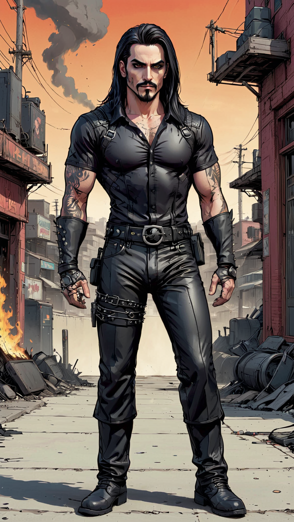 Supervillain with infernal ties. He can cause quakes by stomping, and has the ability to magnifyi any negative emotions, especially anger. He tends to smolder with red flames in some spots of his body. Caucasian male, masculine. Speed Metal/Death Metal fan. Tall, lanky, slender but muscular, sinewy, well defined. Pale skin, dark eyes, dark Goatee on face. Straight, black, long hair, parted down the middle. 3 spiked piercings running down his forehead. Dark Goth make-up around his eyes. He wears a black, long sleeved mesh T-shirt. Black Leather bracers on his arms with barbed wire. Black leather pants. Black leather belt with spikes, heavy black engineer boots. He has infernal ties, so he exudes faint black smoke wherever he goes, and might be smoldering a little. Full body pose.