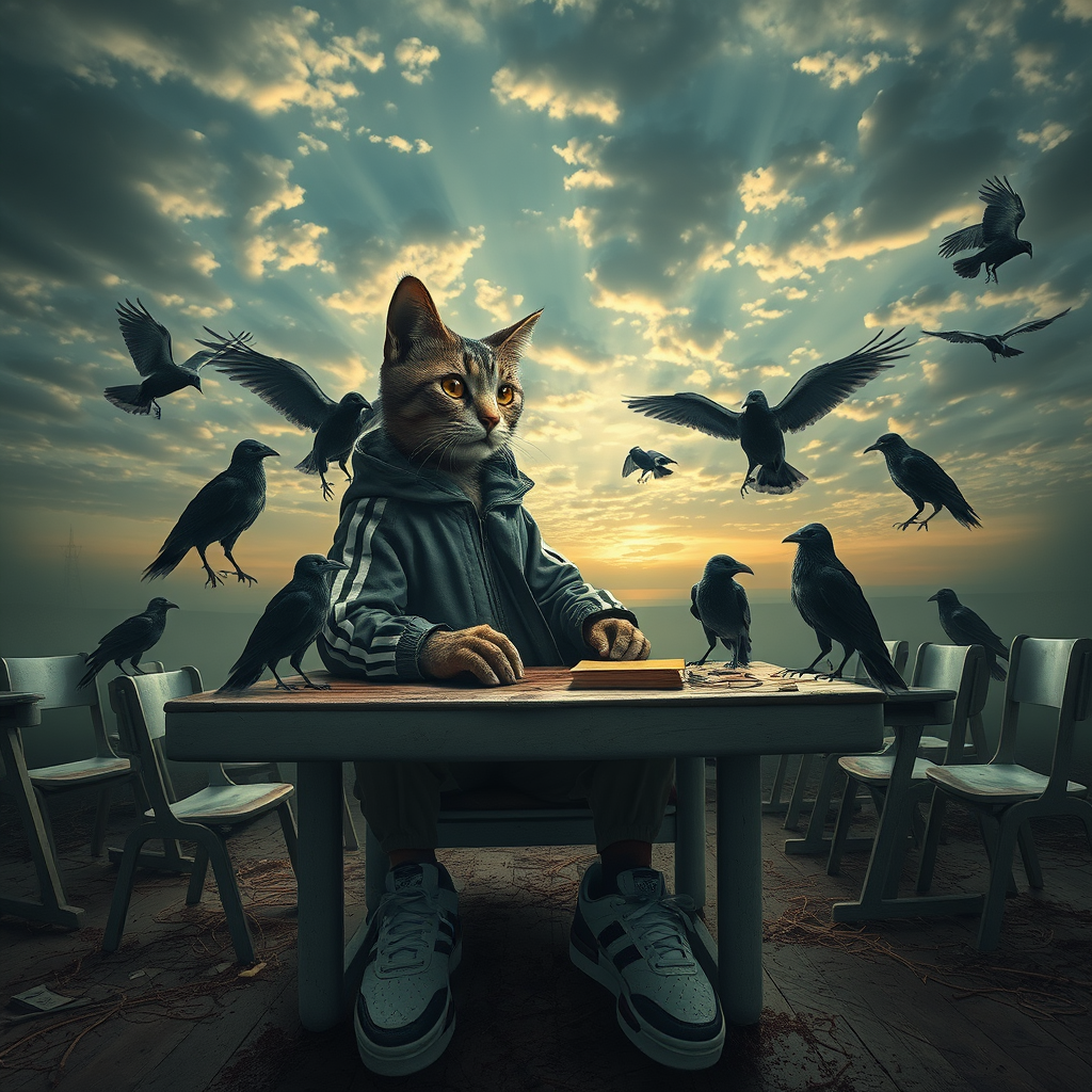 Supper realism, anthropomorphic adorable cybernetic feline clad in an Adidas jacket and sneakers, surrounded by curious crows, situated in a distressed classroom with overturned tables and scattered chairs, set against a stunning sky. Infused with elements of horror, eerie, unsettling, and haunting ambiance, dominated by gray and green tones. Embodying fantasy through the golden ratio, showcased in an ultrawide, hyper-detailed, cinematic, hyper-maximalist style.