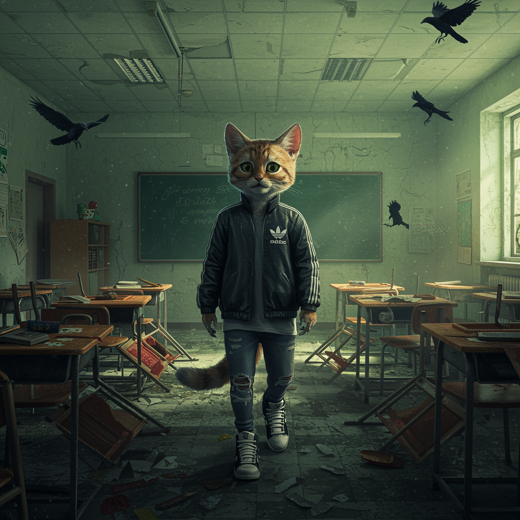 Supper realism captures an anthropomorphic, endearing cybernetic feline adorned in a sleek Adidas jacket and trendy sneakers, navigating through a damaged classroom with disordered tables and chairs amidst curious crows. Above, a stunning sky stretches wide, casting an eerie, haunting glow in shades of gray and green. The scene exudes a blend of horror and fantasy, with a cinematic charm emphasizing the golden ratio in its ultrawide, hyper-detailed, hyper-maximalist composition.