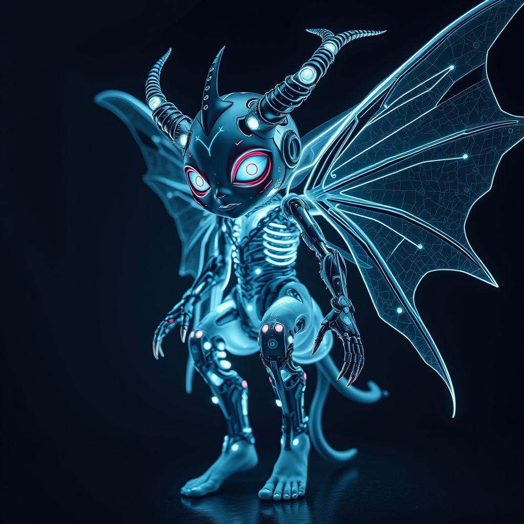 Surreal black light poster of an intricate portrait of an extraordinary cyberpunk elven pixie cyborg creature, barefoot and depicted in full body view. Featuring an adorably cute exterior that contrasts with a hellishly dark soul, it embodies the duality of good and evil, reminiscent of a demon-angel hybrid, and white witchcraft. Presented in hyper realistic and hyper detailed style, the scene boasts a stunning composition with dramatic lighting. It's a cinematic and photo realistic depiction, with intense emotion conveyed through its intricate design and details, captured in 8k resolution.
