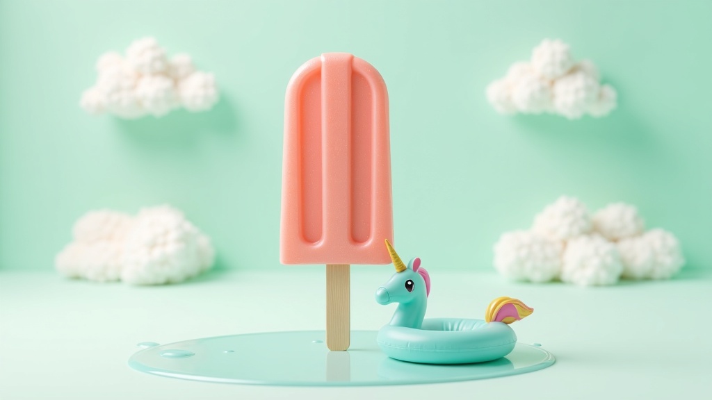 A whimsical, surreal 3D illustration of a coral popsicle dripping into a shimmering puddle on a soft mint background adorned with fluffy clouds. The wooden popsicle stick stands straight, while a miniature inflatable unicorn pool float drifts on the glossy liquid, infusing a playful summer spirit. The colors are vibrant and fresh, exuding a gentle, polished aesthetic with a minimalist design.