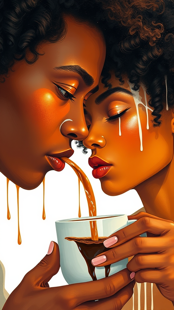 Surreal illustrations capturing the essence of sipping coffee, with vibrant pop colorism, blending hues of dark amber and crisp white. Paint dripping technique adds an otherworldly feel, intertwined with afrofuturistic elements. Realistic portraitures depict an ethereal connection, where time seems poured like liquid -- atmospheric ratio 8:11, with a sensory depth of 750.