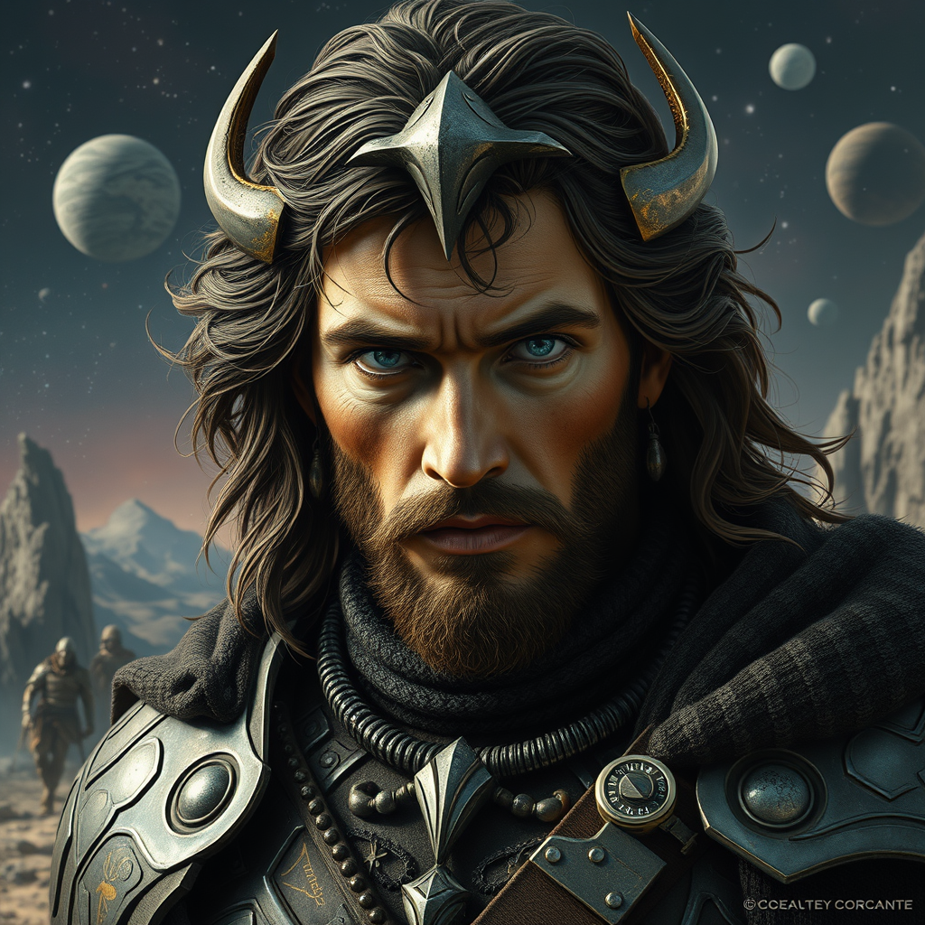 Surreal Krull movie male character design blending the artistic styles of Sergio Toppi and George Barbier, incorporating sci-fi motifs with hyperrealism, minimalism, and photorealism elements; a character exuding rebelcore aesthetics, featuring intricate armor and accessories with futuristic textures, blending classic elegance with avant-garde flourishes, a striking gaze that captures mystery and depth, set against a backdrop of cosmic and otherworldly landscapes, a harmonious fusion of detailed artistry and raw minimalist essence.