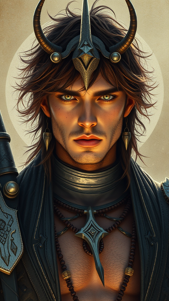 Surreal Krull movie male character design inspired by the styles of Sergio Toppi and George Barbier, blending sci-fi motifs with hyperrealism and minimalism, showcasing features of rebelcore aesthetics. The character exudes a raw, photo-realistic presence, with intricate detailing and an enigmatic aura, balancing elegance and rebellion. The design integrates futuristic elements with classic storytelling, creating a timeless yet otherworldly warrior's visage, emphasizing bold lines and a striking, avant-garde silhouette.