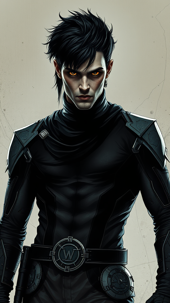 Surreal Krull movie male character design inspired by Sergio Toppi and George Barbier, blending sci-fi motifs with hyperrealism and minimalism, evokes a rebelcore essence; featuring intricate line work, geometric patterns, and bold contrasts, the character wears an avant-garde futuristic outfit with sleek, metallic textures, and exudes a sense of mystery and defiance, embodying a photo-realistic aesthetic with a raw, artistic edge.