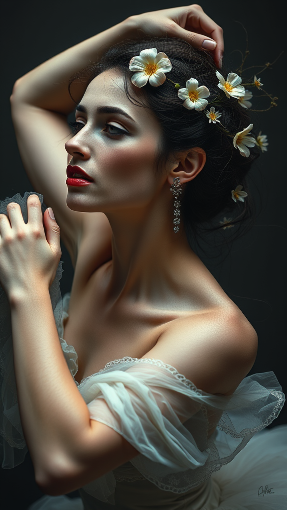 surreal portrait of Elena Glurjidze as a distressed ballerina in a dramatic pose, highly detailed, intricate, sharp focus, shallow depth of field, f/1.4, 85mm, ultra-realistic, dark, moody, aesthetic, 8k resolution, medium format camera, heavy makeup, dramatic hair styling, vibrant colors, asymmetrical face, toned body, by Margot Fonteyn, by Natalia Osipova, by Herman Cornejo, contrapposto sketch of a femme fatale in an elegant pose, low quality, noisy, high contrast, unrealistic, lush, tangled, beautiful, high-res, great anatomy, balanced proportions, symmetrical limbs, strong facial structure, seashell earrings, sparkling necklace, flowers, ivy, laurel, vine, tendrils, across the shoulders, by Gustave Moreau, by Édouard Vuillard, by Fernand Léger.