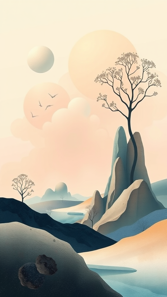 Surreal simplicity in a vertical frame, with dreamlike landscapes blending seamlessly into abstract forms, soft colors intertwining with unexpected textures, gently surreal yet maintaining a serene elegance, stylized with imaginative flair and a subtly heightened sense of the unreal.
