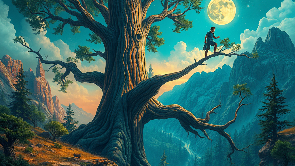 Surreal vision of a person levitating above a grand tree, set within a vibrant fantasy landscape. The scene is infused with psychedelic and surreal elements, where forms appear to melt into one another. Dominant hues of teal and bronze fill the composition, projecting energy and life. The artwork exudes a hikecore essence, capturing the sublime beauty of the wilderness. It evokes the feeling of awe, as if seeing the most astonishing sight. The style resonates with elements of poster art, beautifully crafted to leave viewers in wonder.