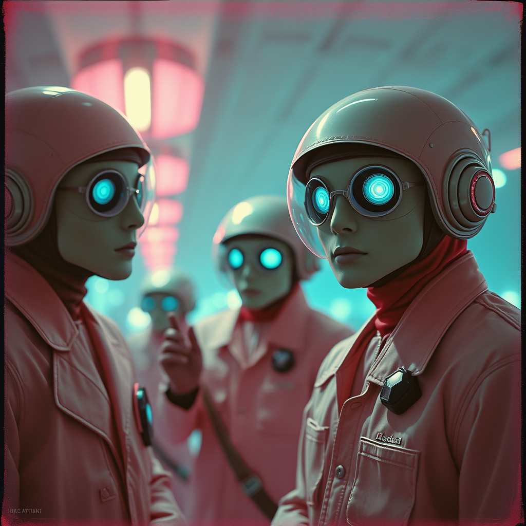 Surrealism-inspired photography featuring masquerade space travelers captured in a 1960s vintage style with a cyberpunk twist. The scene is ultra-realistic, presented in a cinematic fashion reminiscent of classic technicolor films. Taken with a 70mm lens at ISO 400 and f4, the image offers dramatic lighting and depth of field yet embraces intentional imbalance and creative imperfections. The composition is slightly cropped, with elements subtly out-of-frame to evoke a sense of polymorphic mystery. The faded, low-contrast watermark and washed-out tones convey a nostalgic, low-res quality as if produced by specialized creators experimenting with the limitations of the era's video technology.