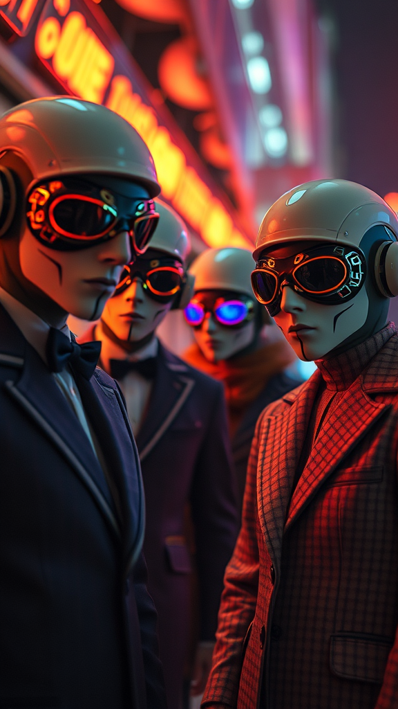 Surrealism-inspired photography featuring masquerade space figures in 1960s attire, blending vintage 60s fashion with a cyberpunk air. Captured in a cinematic and ultra-realistic style reminiscent of 1960s films, the photograph is rich in technicolor with a high-resolution quality. Shot with a 70mm lens at ISO 400, f/4, and 1/20 shutter speed, the image highlights dramatic lighting and depth of field, yielding a uniquely cropped, imbalanced frame. Despite specialized creators, the image has a washed-out, low-contrast watermark, giving it a distinctive low-resolution and low-quality appearance, as though poorly drawn or depicted through a limited video, resulting in a polymorphic and out-of-frame aesthetic.