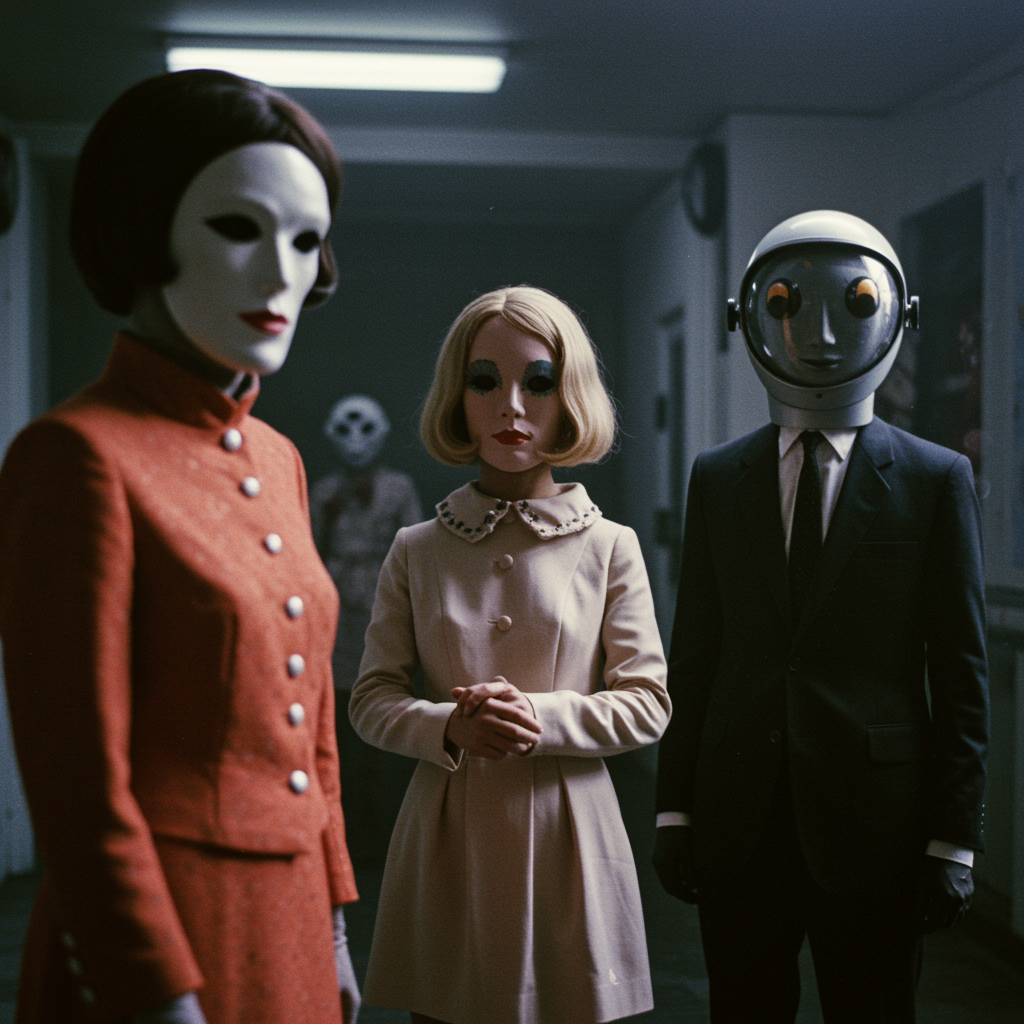 Surrealism-inspired photography featuring masquerade space figures from the 1960s. Blending elements of vintage 1960s fashion with a touch of cyberpunk influence, this ultra-realistic cinematic composition captures the essence of the era. Shot with a 70mm lens and set to ISO 400, f4, and 1/20, this 8K technicolor photograph offers dramatic lighting and depth of field. The cropped-frame provides an intentional imbalance, incorporating elements of low-quality and limited video aesthetics. Specialized creators have crafted polymorphic forms, imbuing the image with a washed-out, low-contrast watermark. The scene is visually intriguing, with figures partially out-of-frame and low-resolution details, evoking the sense of a poorly drawn yet nostalgically captivating moment.